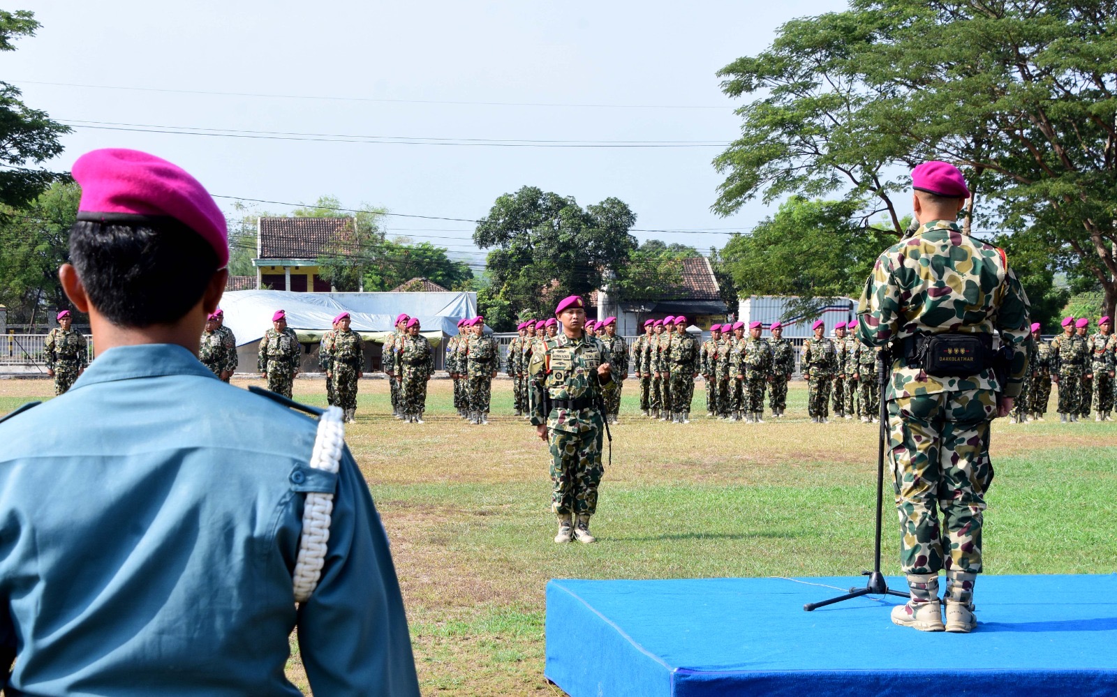 Dispen Kormar (Pasuruan). Segenap prajurit pelatih Mako Kima Komando Latih Korps Marinir (Kolatmar), Puslatsus, Puslatpurmar 3 Grati dan PNS melaksanakan apel khusus dalam rangka rangkaian HUT Korps Marinir Ke 79 tahun yang dipimpin langsung Dankolatmar Kolonel Marinir Dede Harsana, S.A.P., M.Han., di lapang apel Mako Kolatmar Grati, Pasuruan. Jumat (15/11/2024).