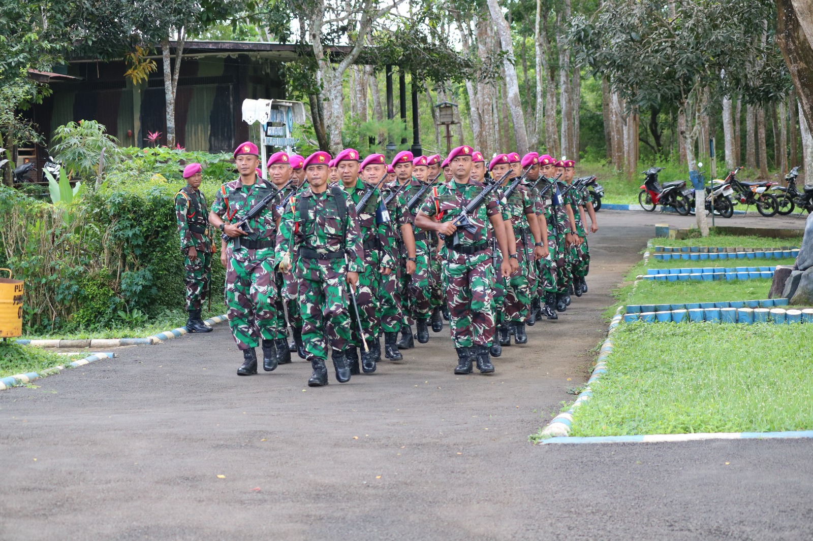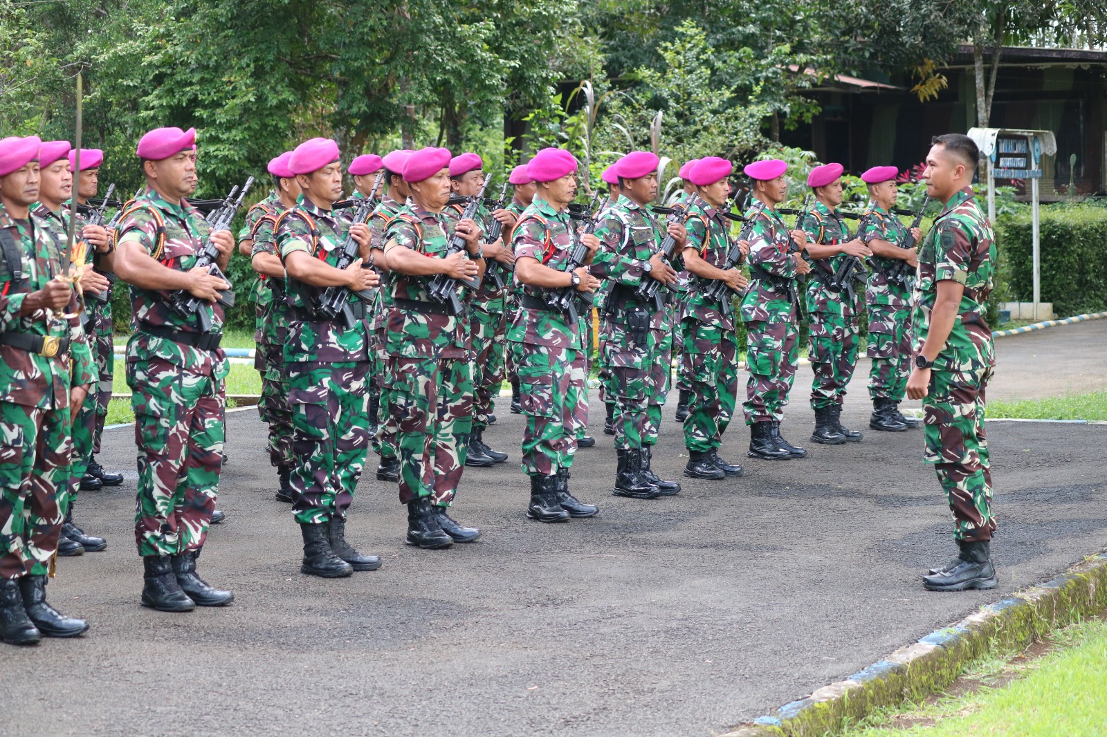 Dispen Kormar ( Malang ) Danpuslatpurmar-4 Purboyo memimpin secara langsung kegiatan latihan baris berbaris prajuritnya di Mako Puslatpurmar-4 Purboyo Malang Selatan, Senin (03/03/2025).