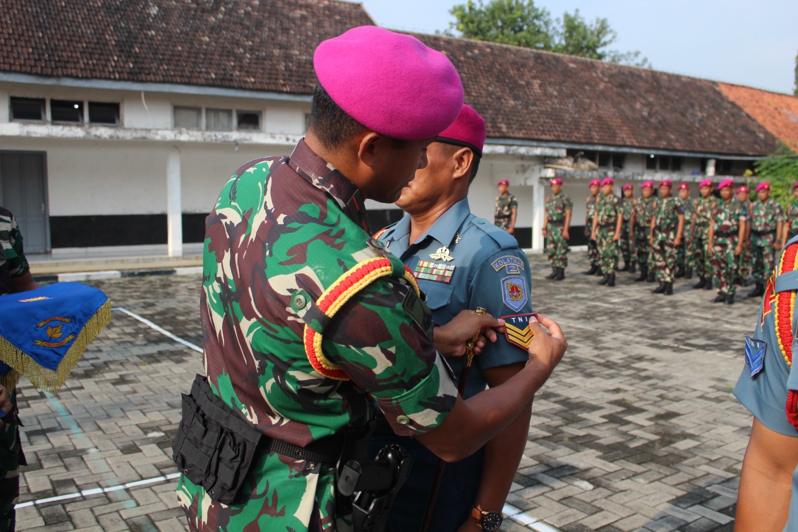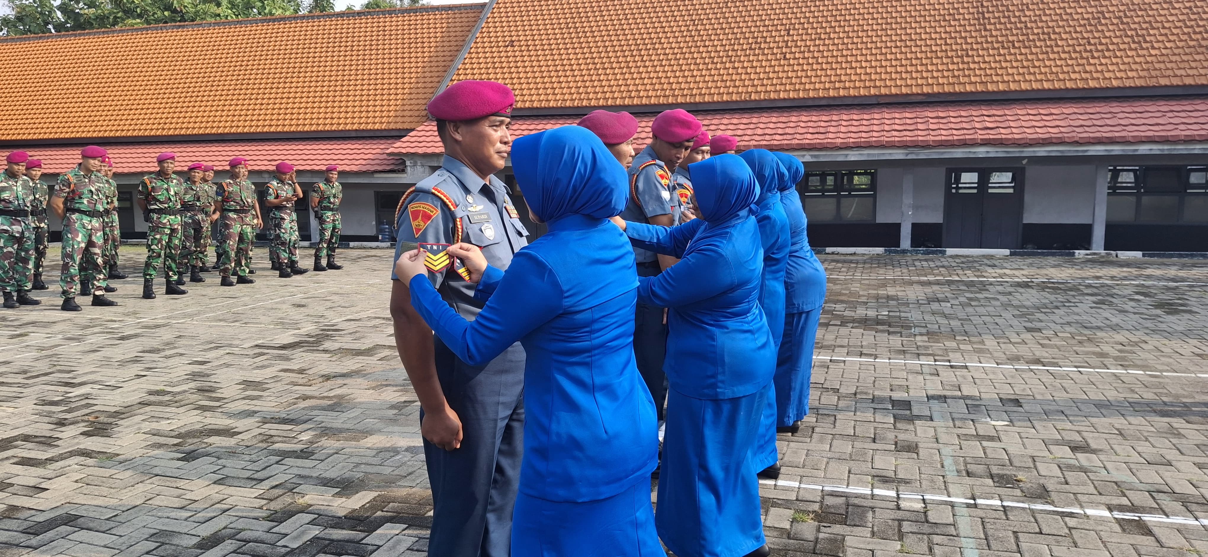 TNI AL,Dispen Kormar (Surabaya) - Komandan Pusat Latihan Pasukan Pendarat (Danpuslatpasrat) Mayor Marinir Nurdin, M.Tr.Opsla., pimpin upacara kenaikan pangkat Bintara dan Tamtama Korps Marinir di lapangan apel Puslatpasrat Kesatrian Marinir Ewa Panggalila, Gunungsari, Surabaya, Senin (14/04/2025)