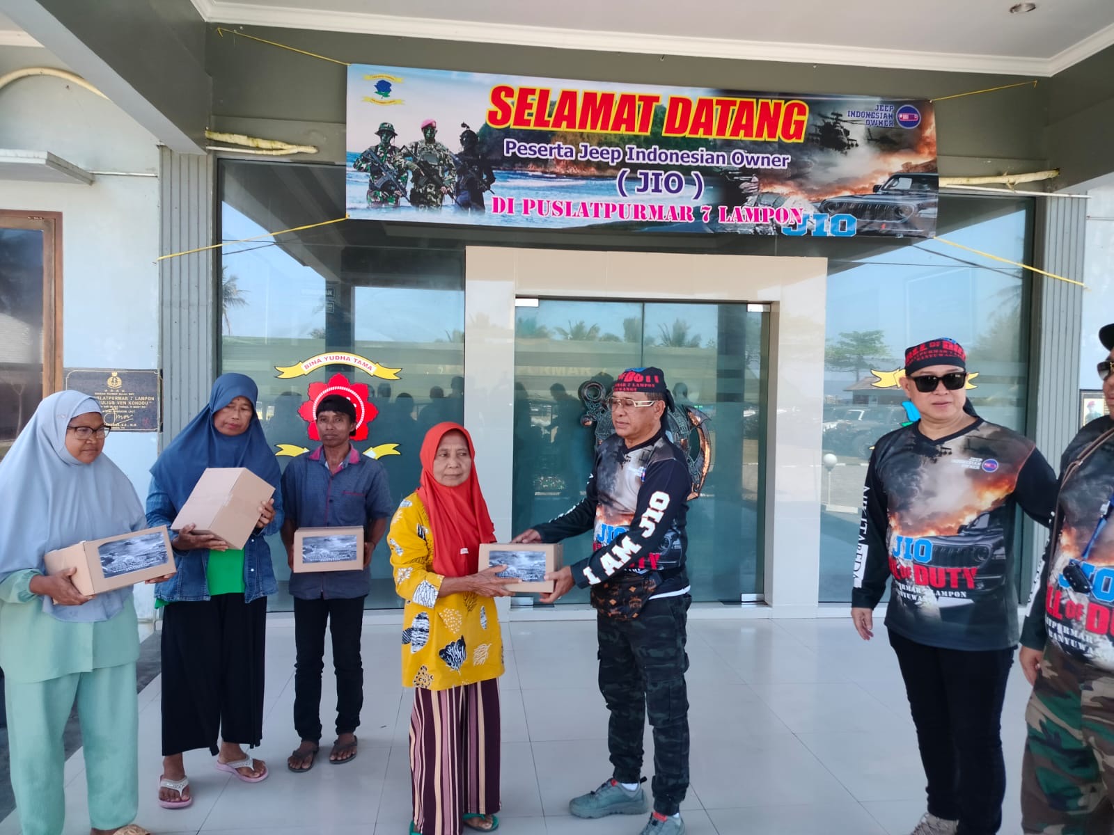 Diawali dari Hotel Kokoon Banyuwangi rombongan menuju Puslatpurmar 7 Lampon dan tiba di Mako Puslatpurmar 7 Lampon disambut langsung oleh Danpuslatpurmar 7 Lampon, setelah itu acara ceremonial, tarian gandrung, acara sambutan oleh Danpuslatpur, setelah itu sambutan oleh ketua JIO, serah terima cindera mata di lanjutkan penyerahan bantuan sosial kepada warga nelayan Kampung Baru pesisir pantai Lampon.