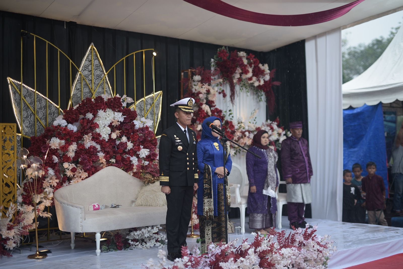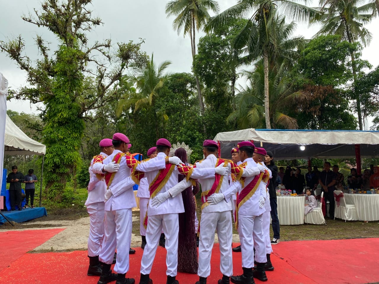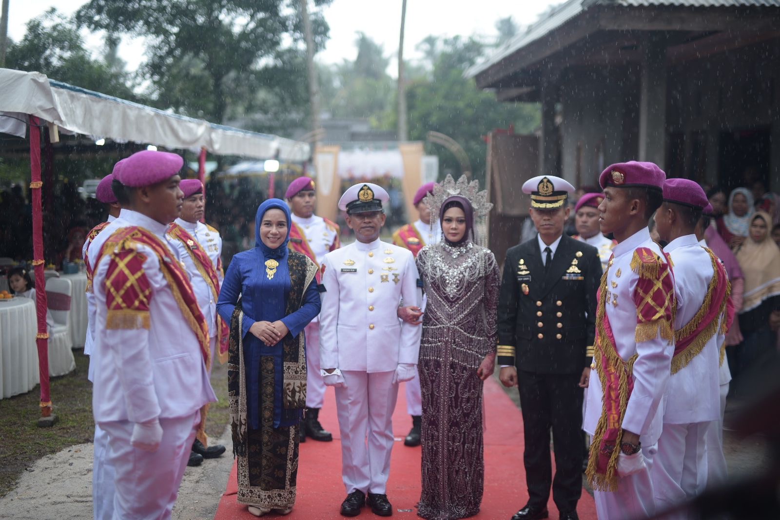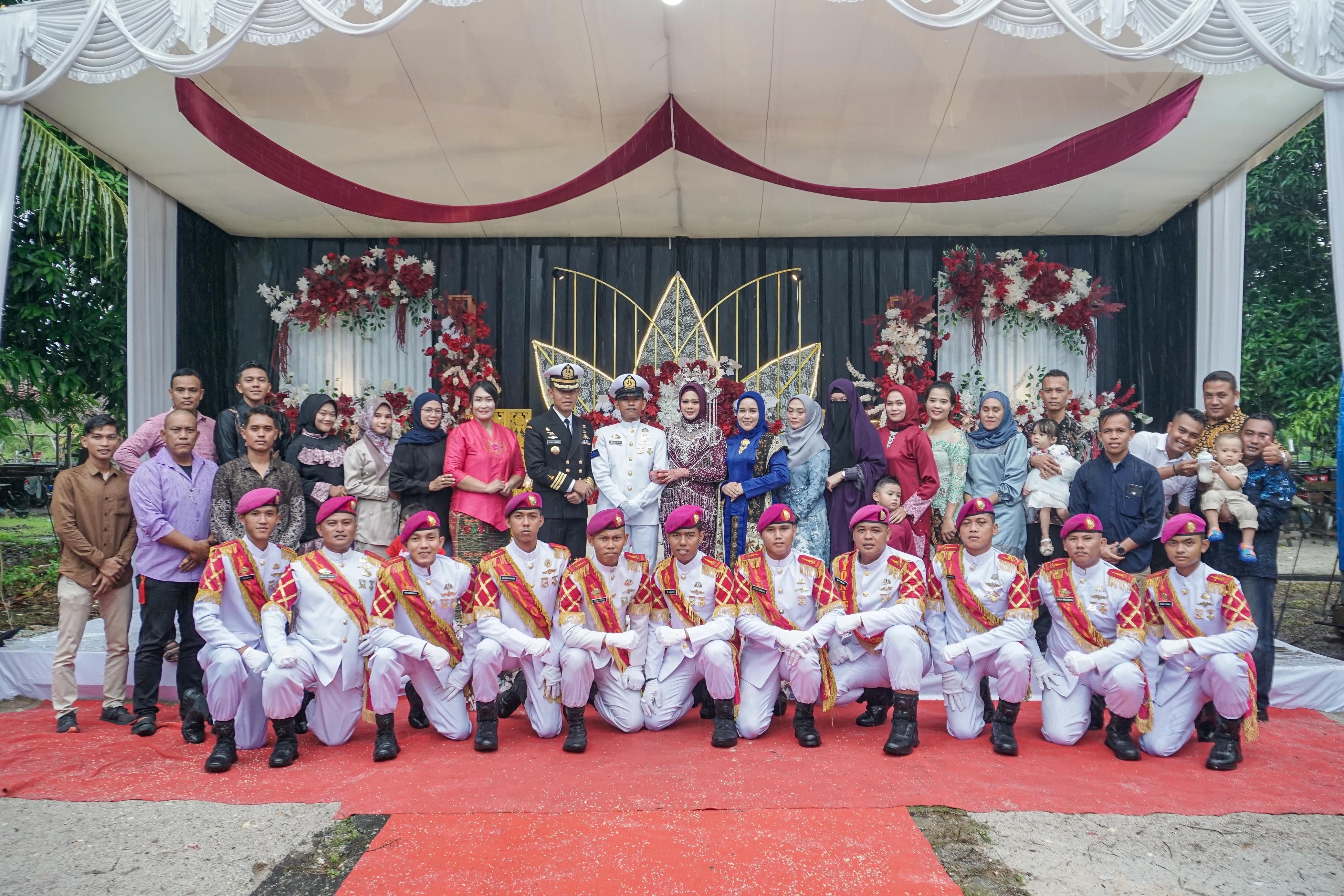 TNI AL, Dispen Kormar (Dabo Singkep). Guna menjaga tradisi khas TNI Angkatan Laut, prajurit pelatih Puslatpurmar 9 Dabo Singkep mendukung kegiatan upacara Hasta Pora pernikahan. berlangsung di Desa Kebun Nyiur Kecamatan Singkep Kabupaten Lingga, Provinsi Kepulauan Riau dan disaksikan masyarakat umum dengan suka cita dan meriah (07/07/2024).