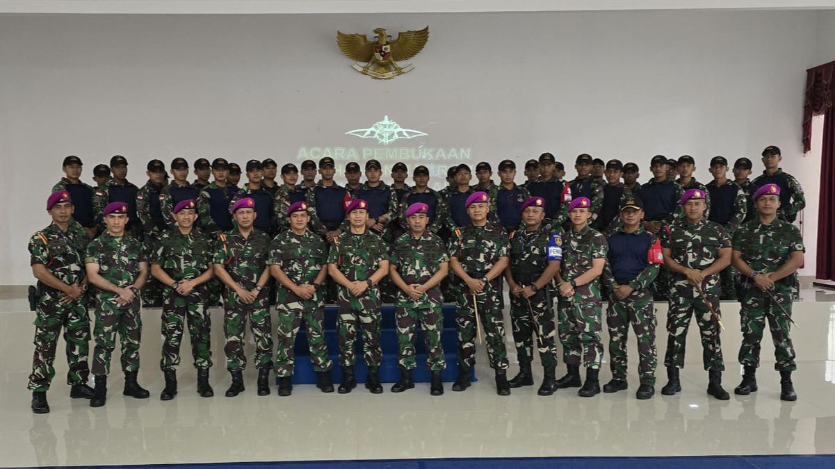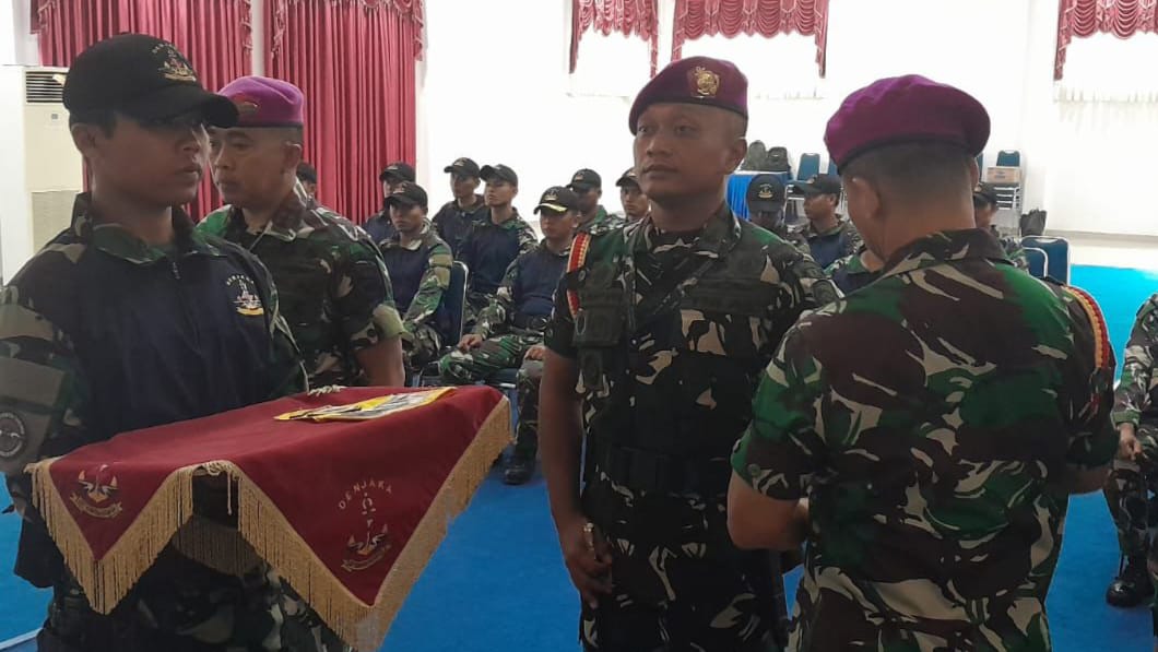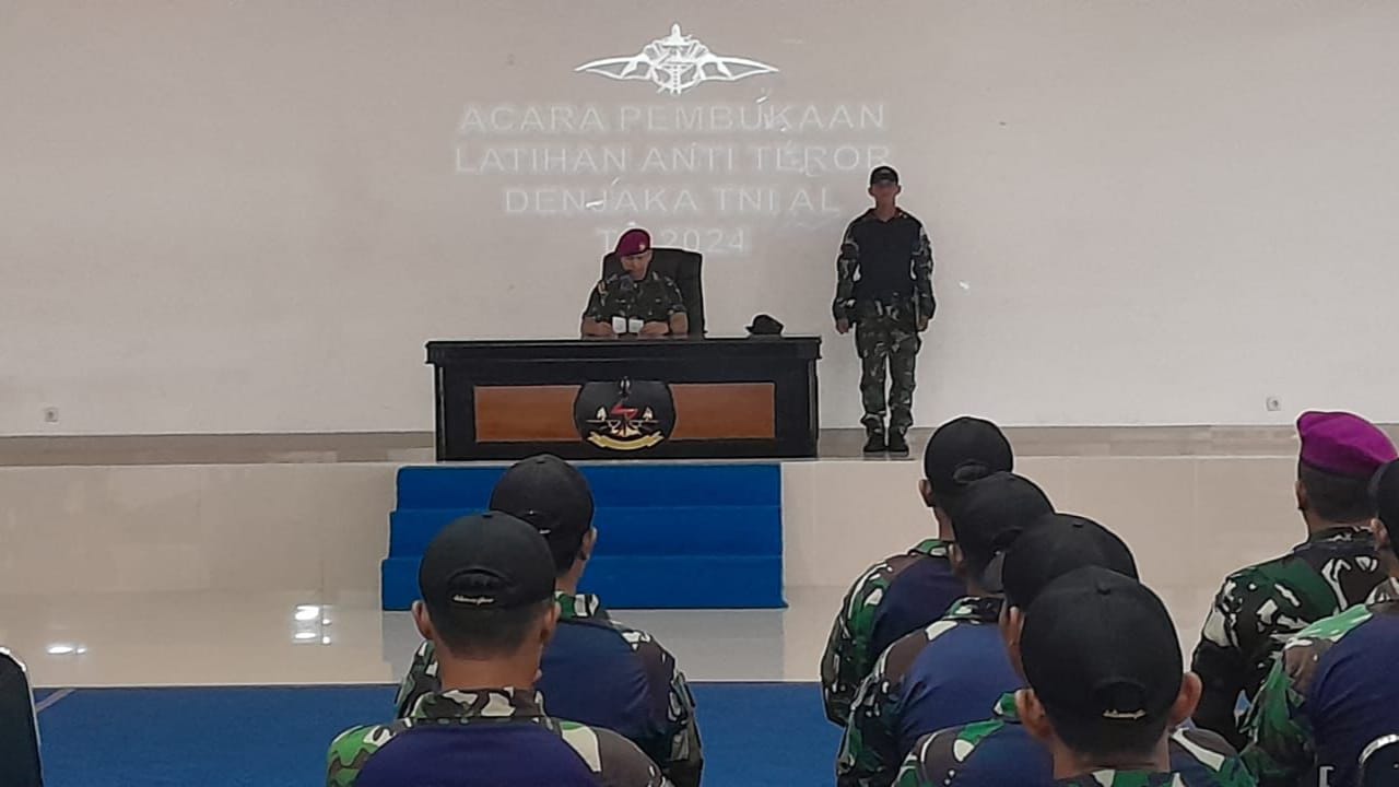 Dalam acara pembukaan latihan anti teror Denjaka TA. 2024 yang dipimpin oleh Dankolatmar selaku Inspektur upacara menyematkan badge kepada Danpuslatsus selaku penilai latihan tersebut yang di laksanakan di Bapra Mako Denjaka.