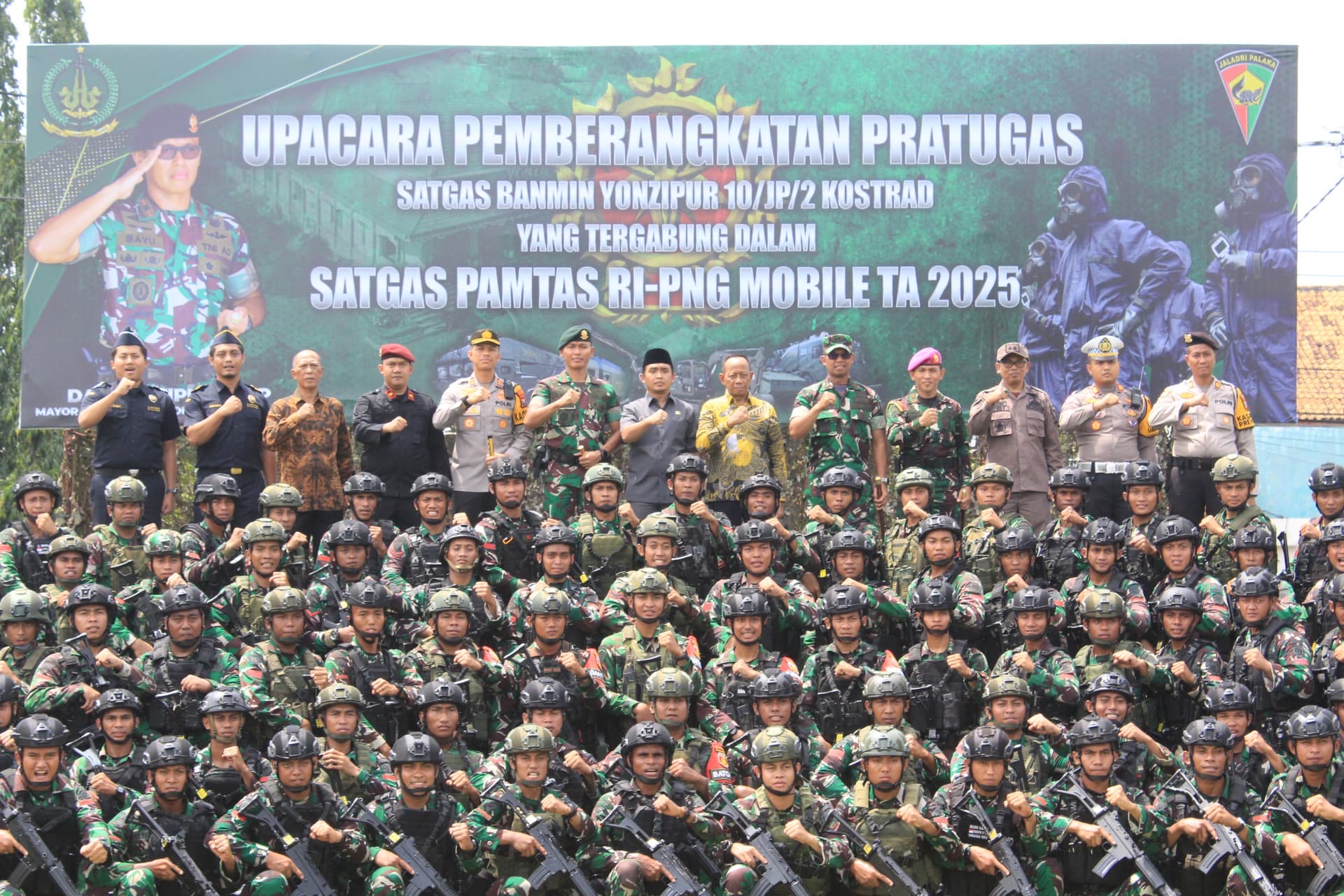 Pasuruan â Komandan Pusat Latihan Khusus (Danpuslatsus), Mayor Marinir Alamsyah, S.H., M.Tr. Opsla., bersama Forkopimda Pasuruan, menghadiri upacara pemberangkatan Satgas Banmin Yonzipur 10/JP/2 Kostrad yang tergabung dalam Satgas Pamtas RI-PNG Mobile TA 2025. Acara berlangsung di Lapangan Yonzipur 10 Kostrad, Pasuruan, Sabtu (11/01/2025).