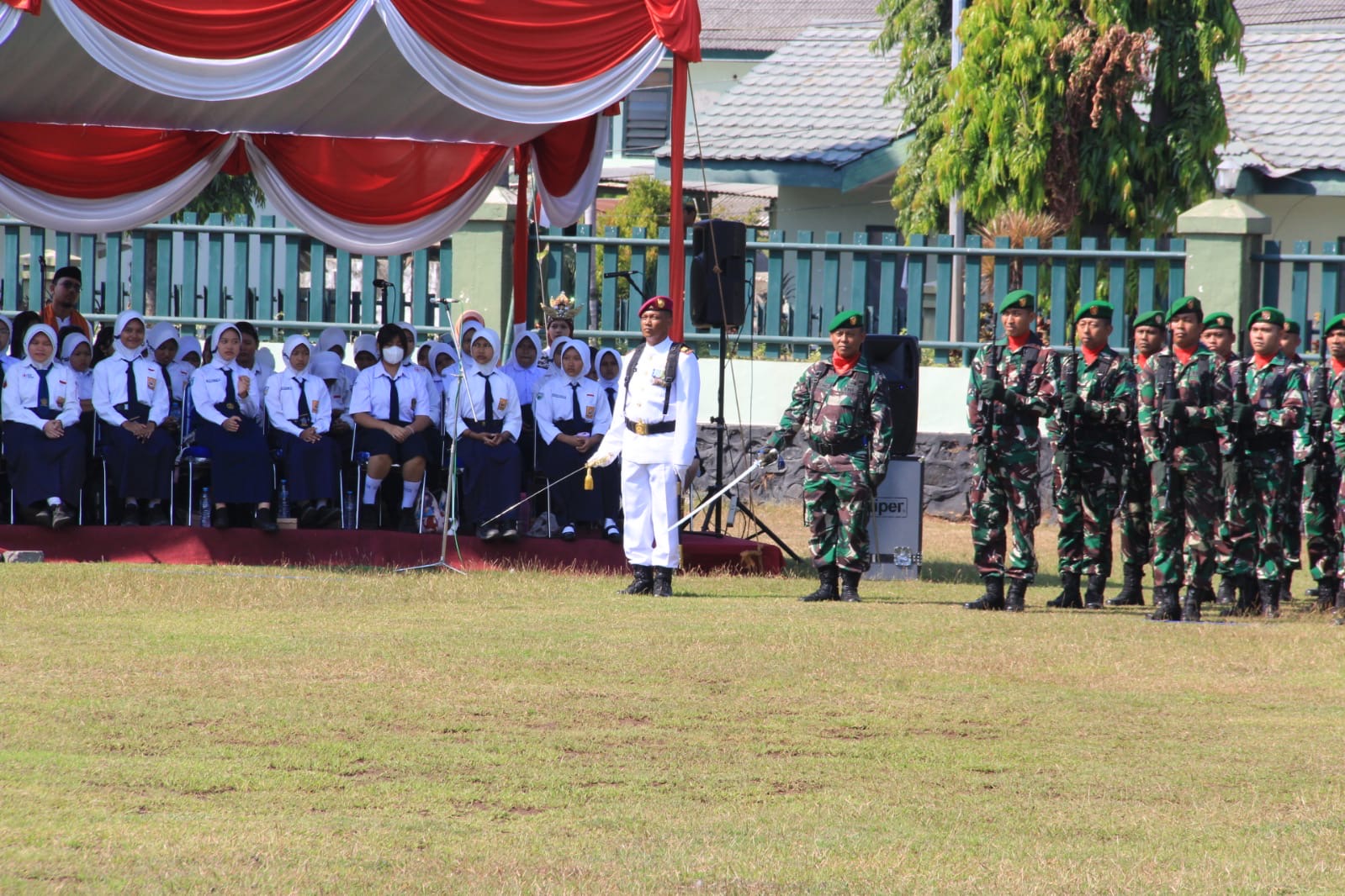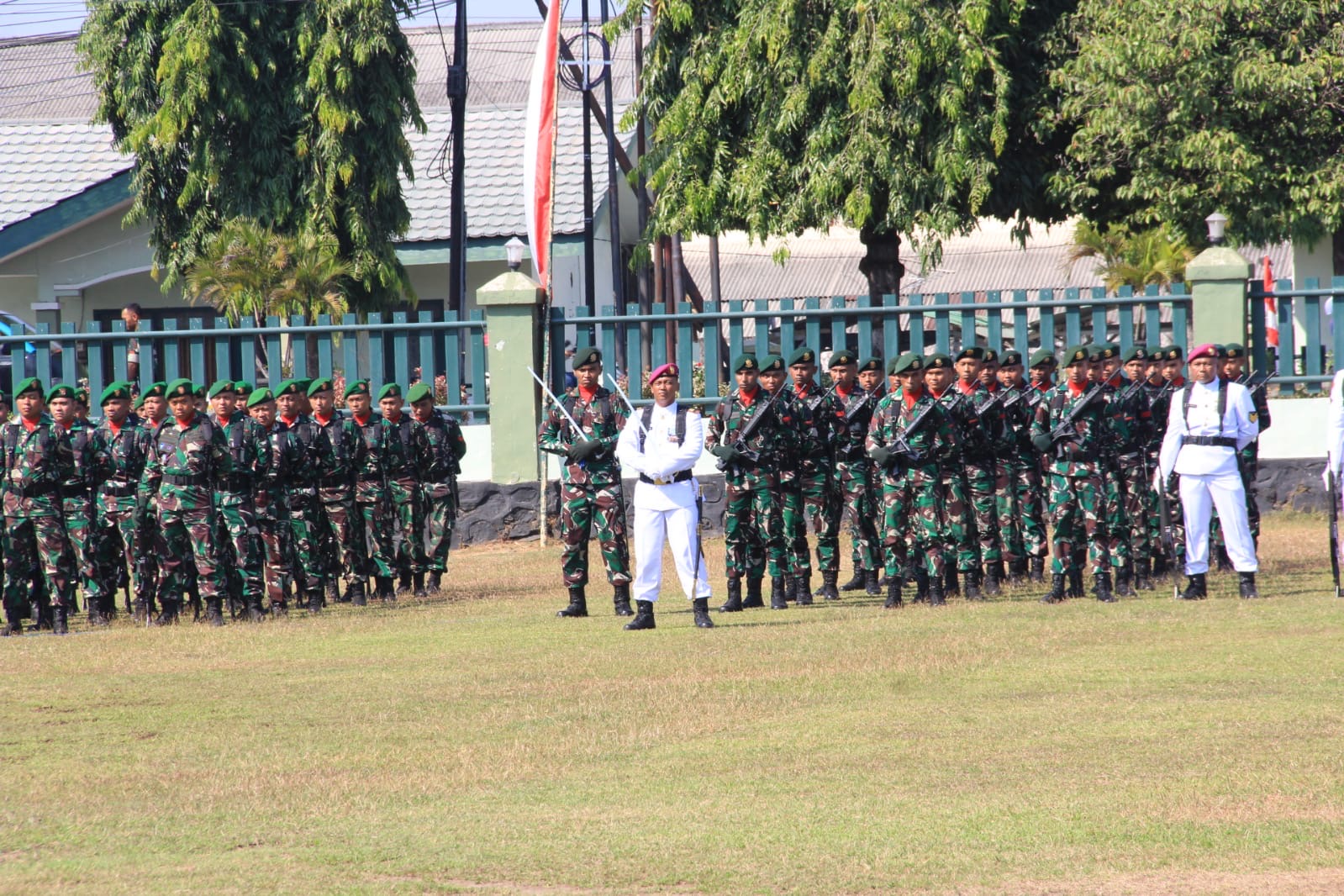 Komandan Pusat Latihan Khusus (Danpuslatsus) Letkol Marinir Empri Airudin dan Ibu Ketua Ranting C Jalasenastri Cabang 5 PG Kormar Ny. Nilam Empri Airudin beserta perwakilan prajurit Puslatsus dengan Khidmat mengikuti jalannya upacara HUT kemerdekaan Republik Indonesia Ke 79 di lapangan Yon Zipur 10 Kostrad Pasuruan, Sabtu ( 17/08/2024 ).