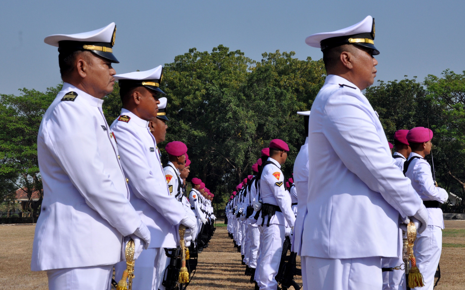 Komandan Komando Latih Korps Marinir (Dankolatmar) Kolonel Marinir Dede Harsana, S.A.P., M.Han memimpin upacara peringatan HUT Kemerdekan RI ke 79 tahun di lapangan Mako Kolatmar Grati, Pasuruan, Sabtu (17/08/2024).