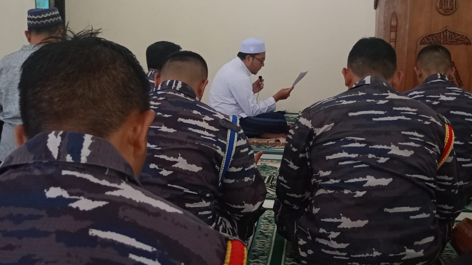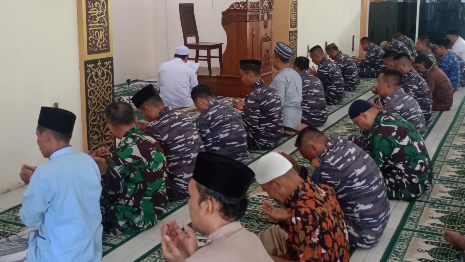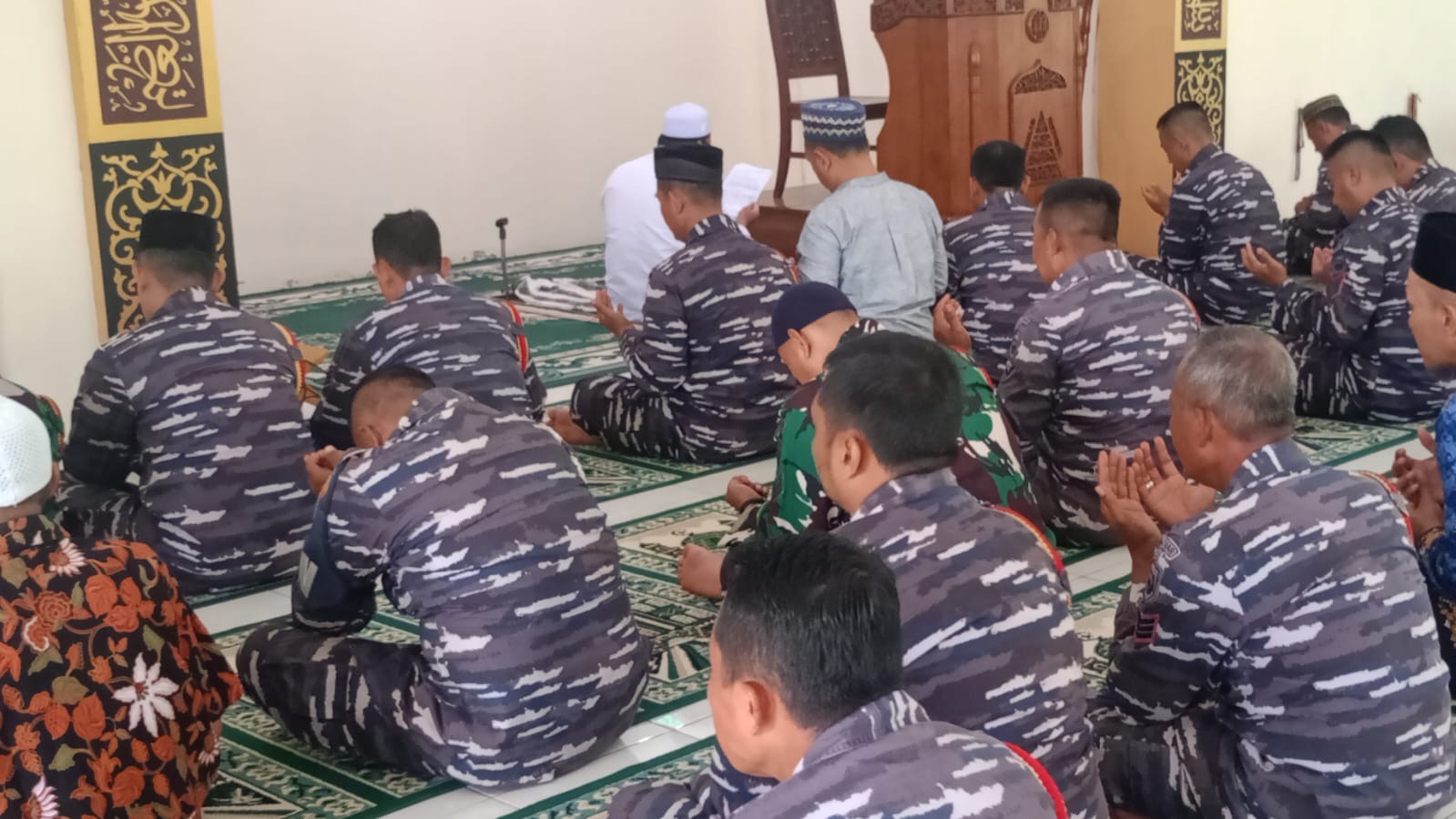 Dispen Kormar (Pasuruan). Komando Latih Korps Marinir (Kolatmar) mengelar doa bersama setelah sholat Jumat di Masjid Jannatin Mako Kolatmar Grati, Pasuruan, Jumat (29/11/2024).