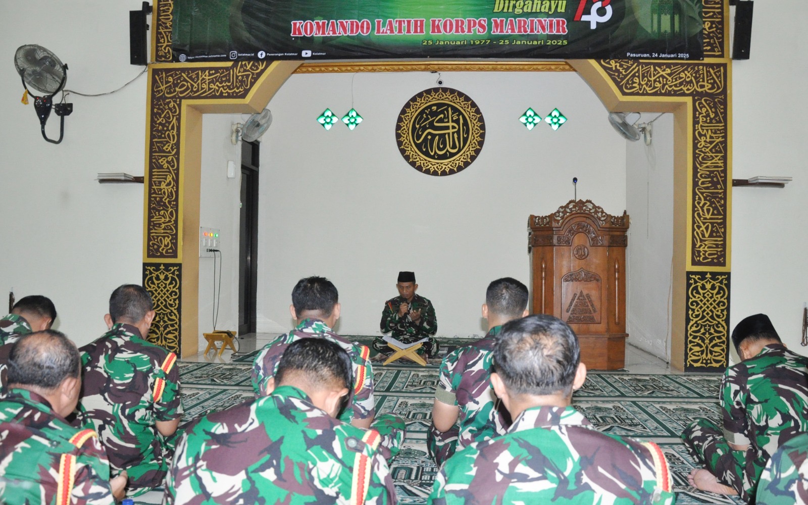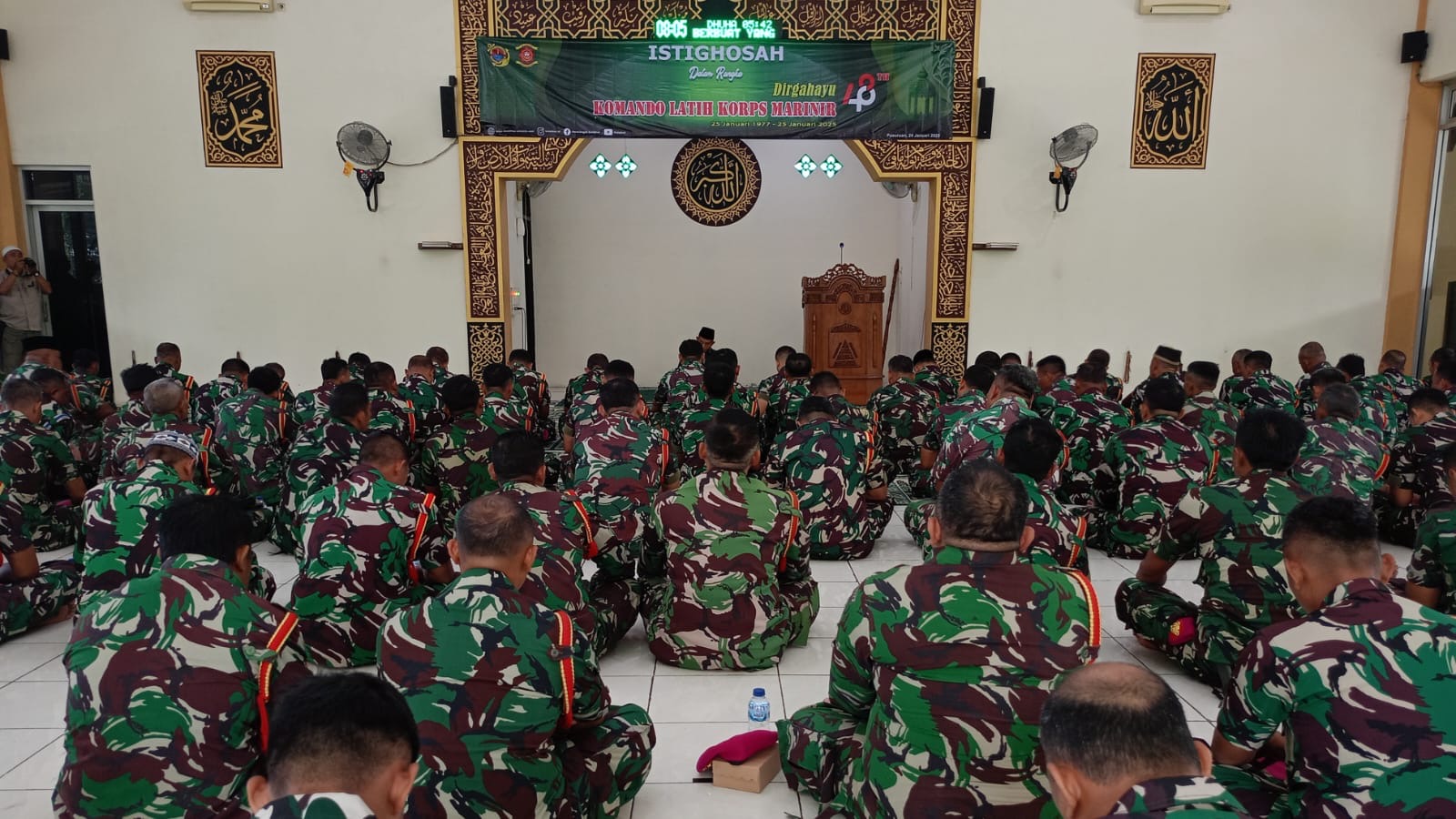 Dispen Kormar (Pasuruan). Komando Latih Korps Marinir (Kolatmar) mengelar doa bersama serentak dengan seluruh jajarannya jelang HUT ke 48 tahun, segenap prajurit Pelatih Mako Kima Kolatmar, Puslatsus, Puslatpurmar 3 Grati dan PNS melaksanakan istigosah dan doa bersama di Masjid Jannatin Mako Kolatmar Grati Pasuruan, Jumat (24/01/2025).