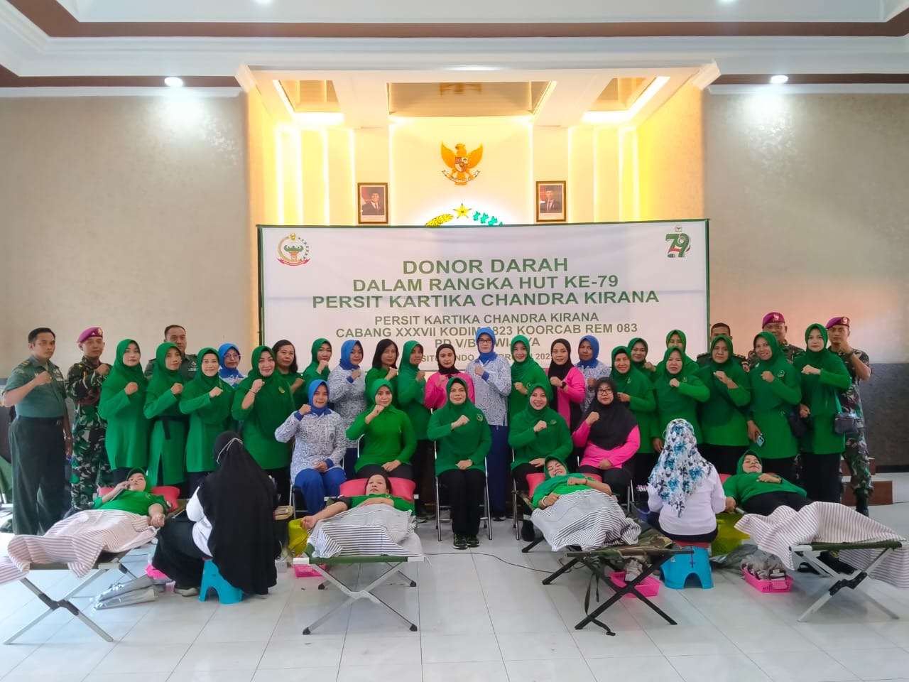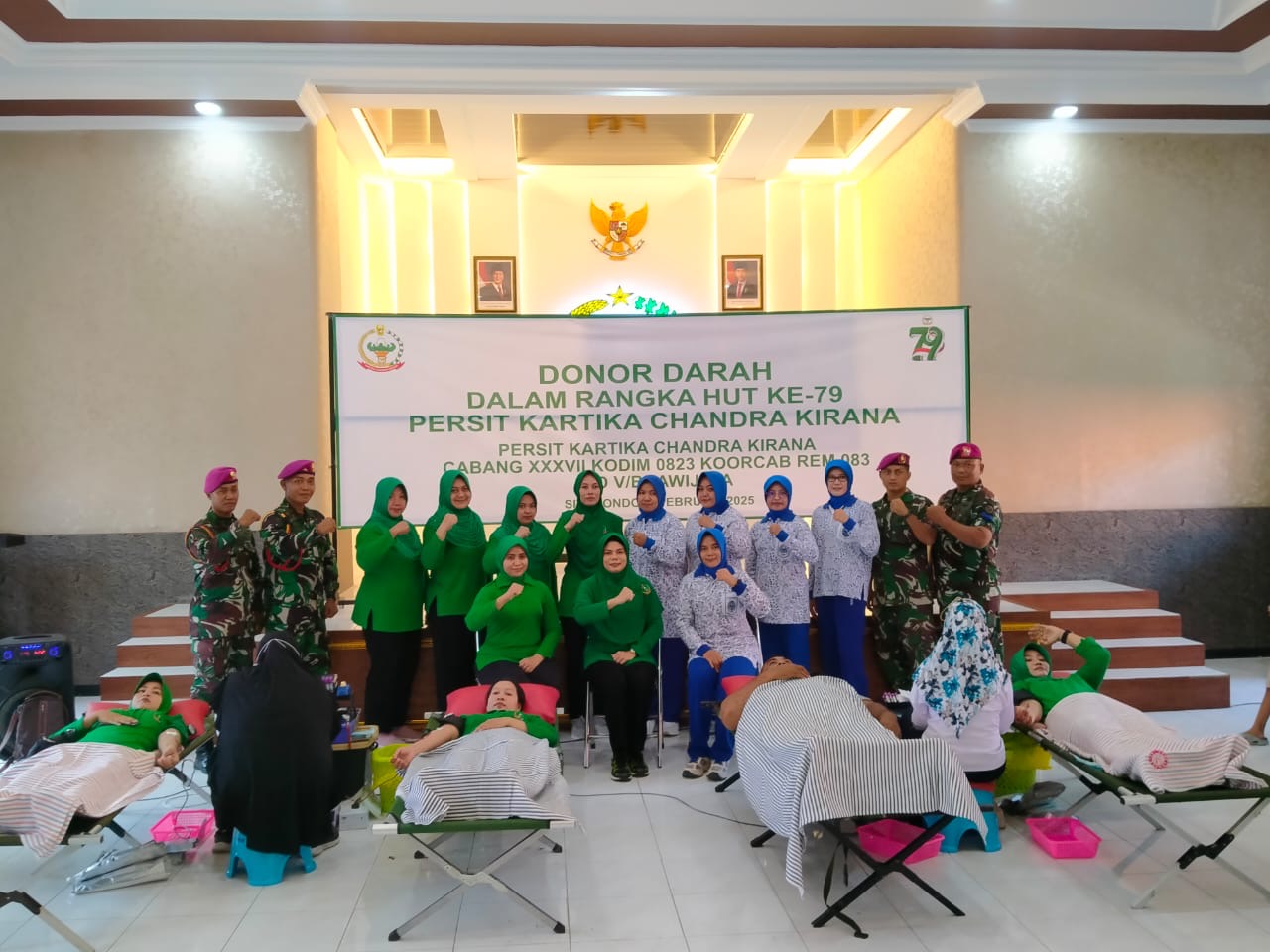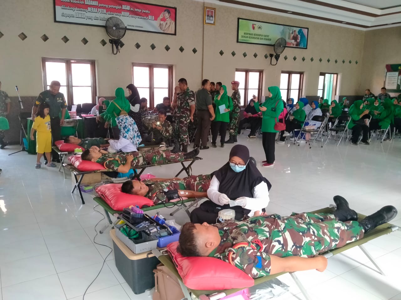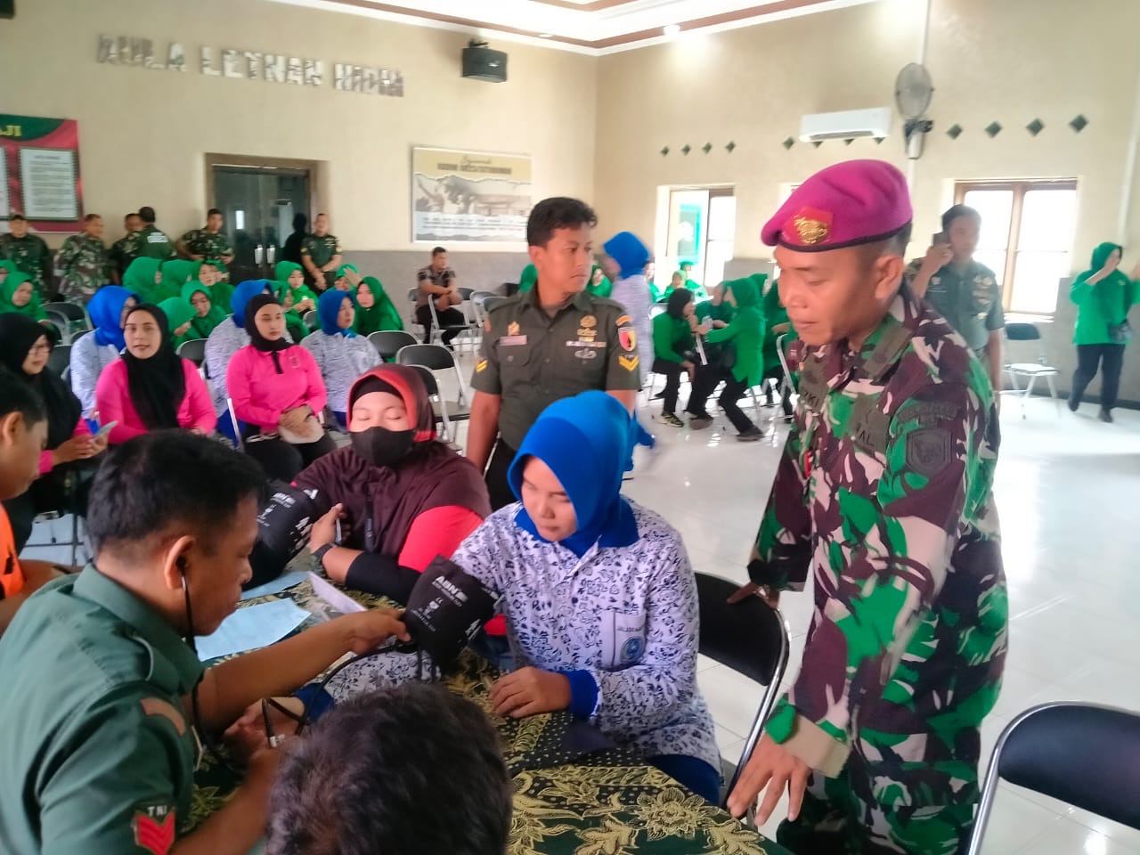 Dispen Kormar (Situbondo). Prajurit Pelatih Pusat Latihan Pertempuran Marinir (Puslatpurmar) -5 Baluran bersama Anggota Jalasenastri Ranting E Cabang 5 PG Kormar mengikuti Donor darah dalam acara Hari Ulang Tahun (HUT) ke 79 Kartika Candra Kirana Tahun 2025 di Aula Letnan Nidin Makodim 0823 Situbondo. Jl PB Sudirman no 32 Situbondo. Rabu, (05/02/2025).