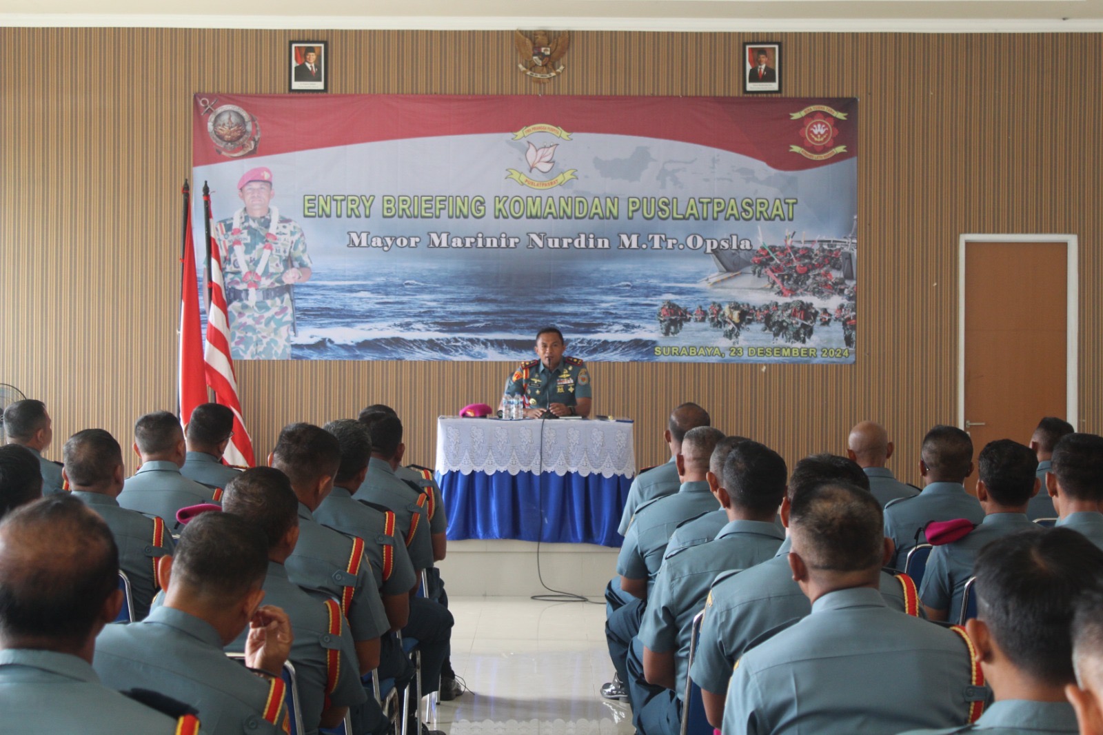 TNI AL, Dispen Kormar (Surabaya)- Mengawali tugas sebagai Komandan Pusat Latihan Pasukan Pendarat (Danpuslatpasrat) Mayor Marinir Nurdin,M.Tr.Opsla., melaksanakan entry briefing dengan seluruh prajurit Puslatpasrat yang dilaksanakan digedung Olah Yudha (OYU) Ksatrian Ewa Panggalila Gunungsari Surabaya, Senin (23/12/24).