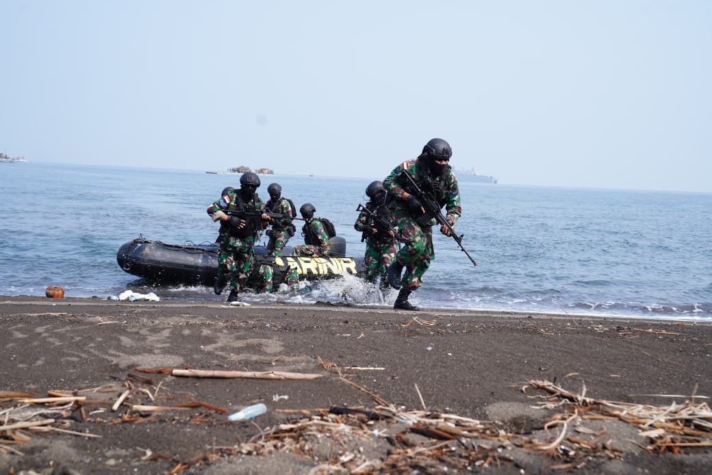 Dalam puncak Latihan Gabungan Bersama Keris Woomera 2024 Komandan Pusat Latihan Khusus Danpuslatsus Letkol Marinir Empri Airudin selaku Excon (Exercise Controller) for Amphibious Operation Keris Woomera 2024 mengendalikan pendaratan Operasi Amfibi di Pantai Banongan Situbondo. Rabu (13/11/2024)