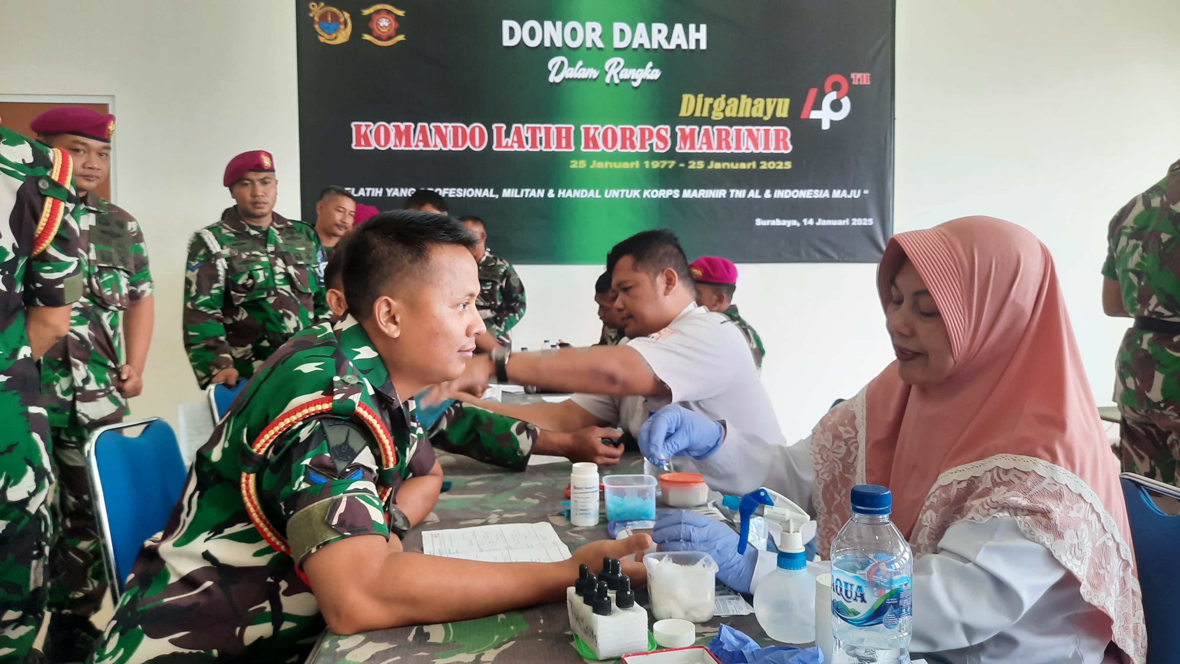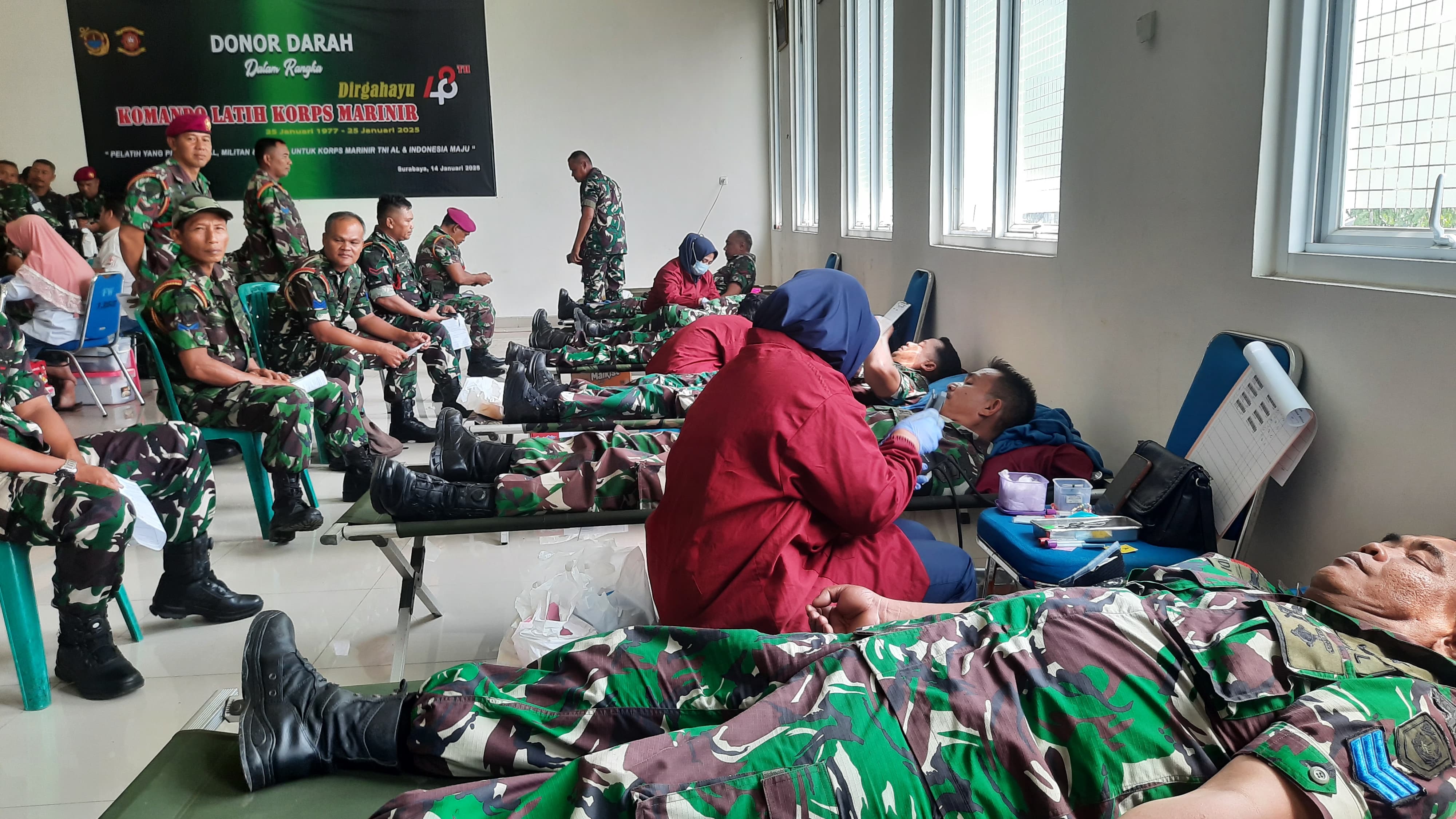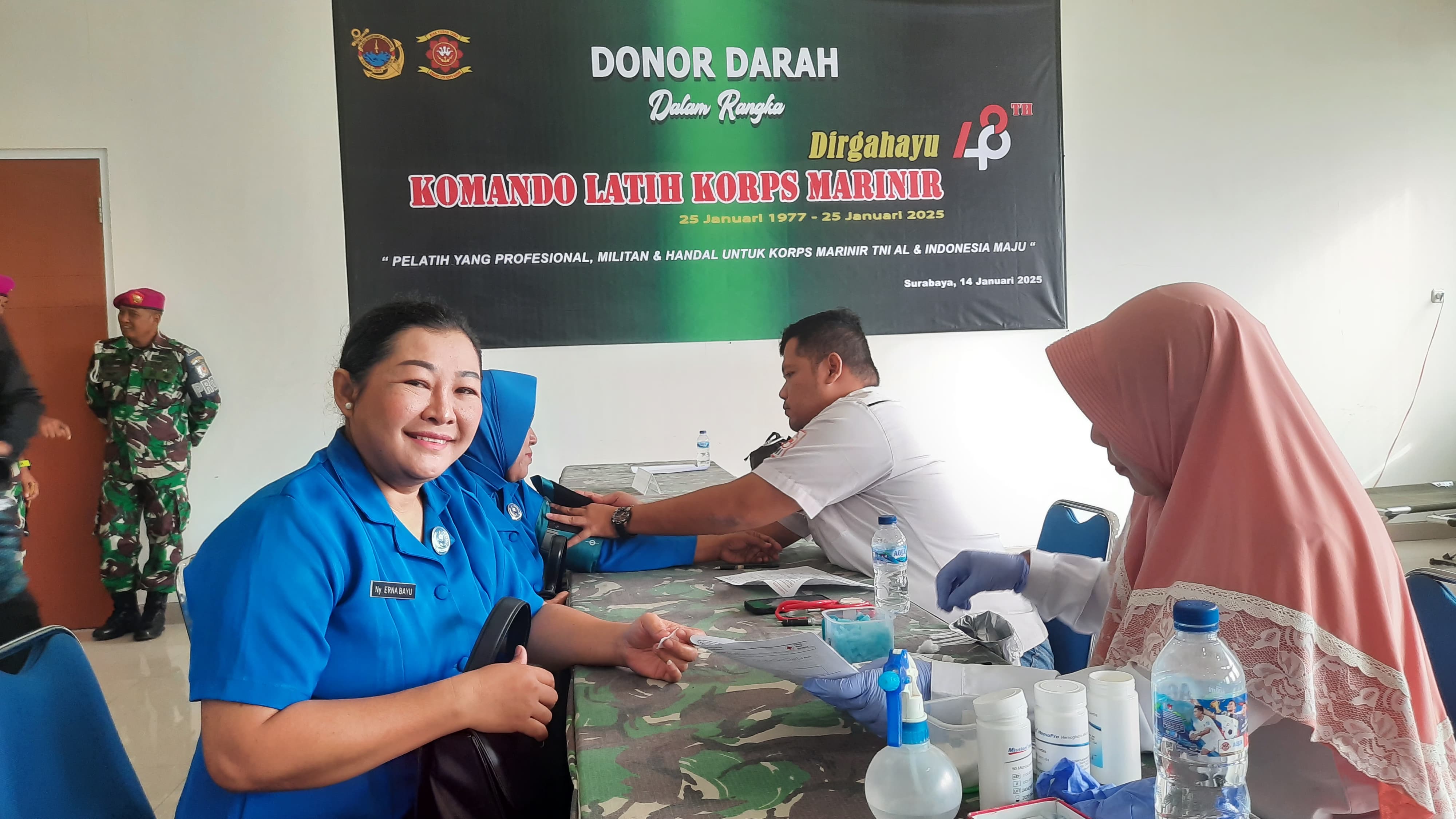 Dispen Kormar, TNI AL (Surabaya)- Menyongsong HUT ke-48 Komando Latih Korps Marinir (Kolatmar)Tahun 2025 serta kepedulian terhadap sesama, Prajurit Puslatpasrat dan Jalasenastri Ranting B Cabang 5 PG Kormar mengikuti kegiatan donor darah di Gedung Olah Yudha (OYU) Bhumi Marinir Gunungsar Surabaya, Jawa Timur, Selasa (14/01/2025).