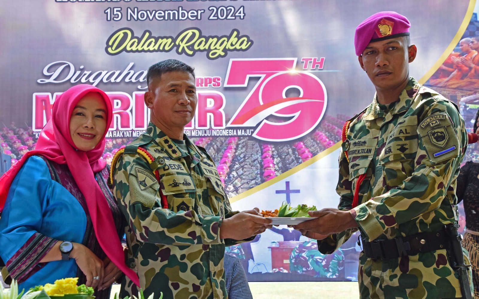Dispen Kormar (Pasuruan). Ketua Cabang 5 PG Jalasenastri Korps Marinir Ny. Evi Dede Harsana bersama pengurus damping Dankolatmar dalam syukuran rangkaian HUT Marinir ke 79 tahun di Caffe Tudha Tama Mako Kolatmar Grati, Pasuruan, Jumat (15/11/2024).