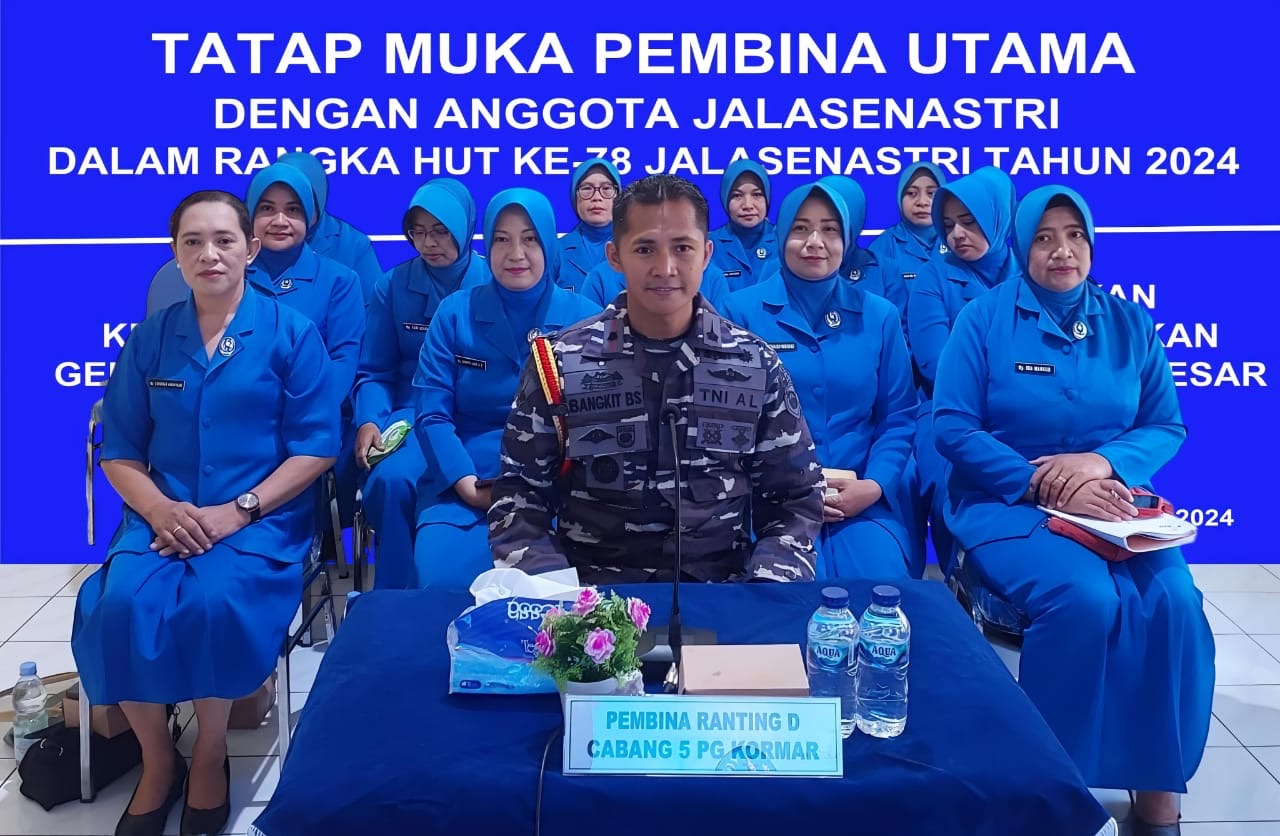 Dispen Kormar (Jakarta) - Ketua Cabang 5 PG Kormar Ny. Evi Dede Harsana mengikuti Tatap Muka dengan Kepala Staf Angkatan Laut selaku Pembina Utama Jalasenastri Laksamana TNI Dr. Muhammad Ali, S.E., M.M., M.Tr.Opsla., dan Ketua Umum Jalasenastri Ny. Fera Muhammad Ali., dengan seluruh anggota Jalasenastri, bertempat di Gedung OB. Syaâaf Mako Armada RI, Jakarta, Jumat (23/08/2024).