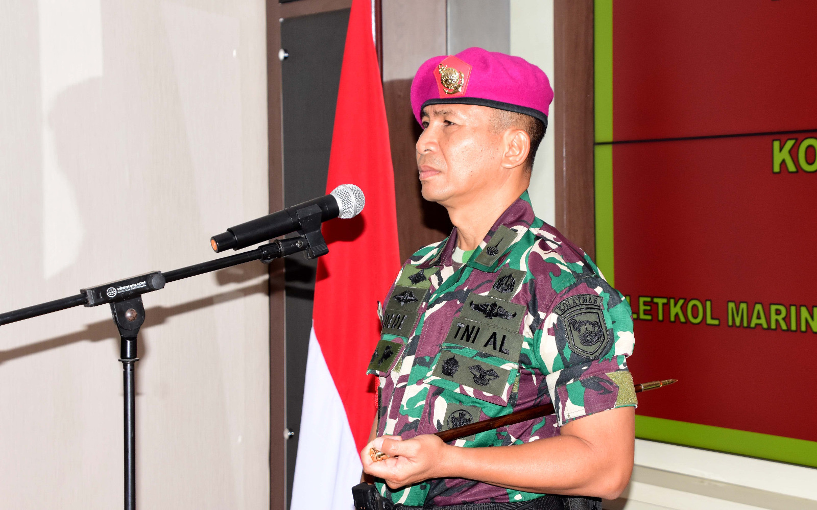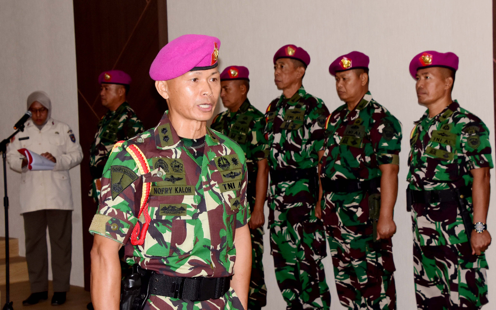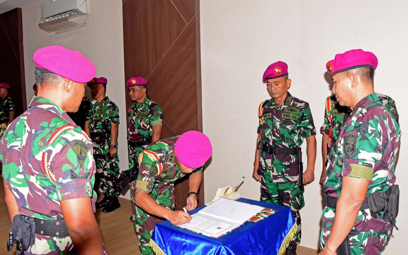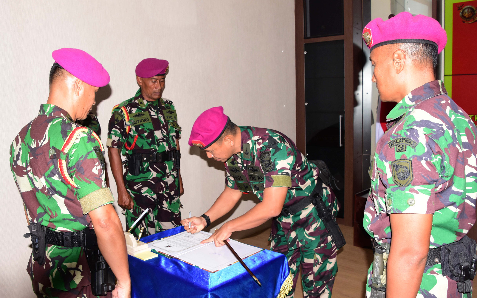 Dispen Kormar (Pasuruan). Komandan Komando Latih Korps Marinir, Kolonel Marinir Dede Harsana, S.A.P., M.Han memimpin serah terima jabatan (sertijab) Perwira Staf Personel (Paspers) Mako Kolatmar, jabatan Paspers Kolatmar yang diserah terimakan dari Komandan Kolatmar kepada Letkol Marinir Nofry George Kaloh, M.Tr.Opsla. di ruang Puskodal Mako Kolatmar Grati, Pasuruan, Jumat (25/04/2025).