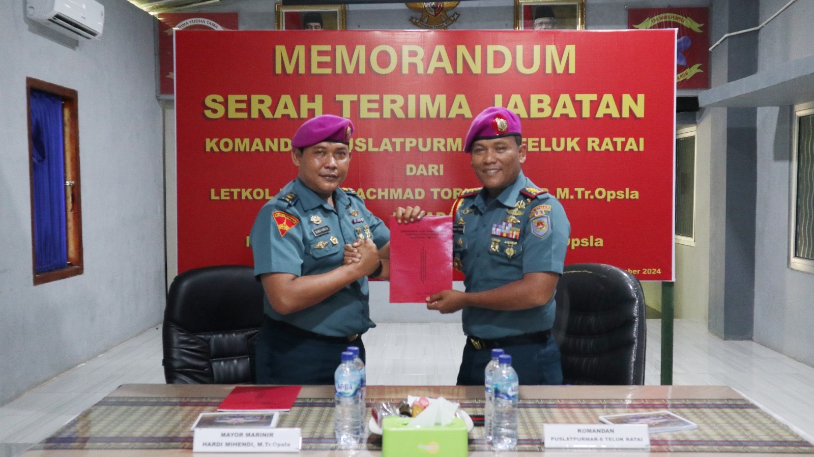 TNI-AL, Dispen Kormar (Lampung)-Puslatputmar-8 Teluk Ratai melaksanakan memorandum dalam rangka serah terima jabatan Komandan dari Letkol Mar Achmad Toripin , S.A.P.,M.Tr.Opsla kepada Mayor Mar Hardi Mihendi, M.Tr.Opsla dan Ketua Ranting I Cabang 5 PG Kormar Lampung. Senin (07/10/2024).