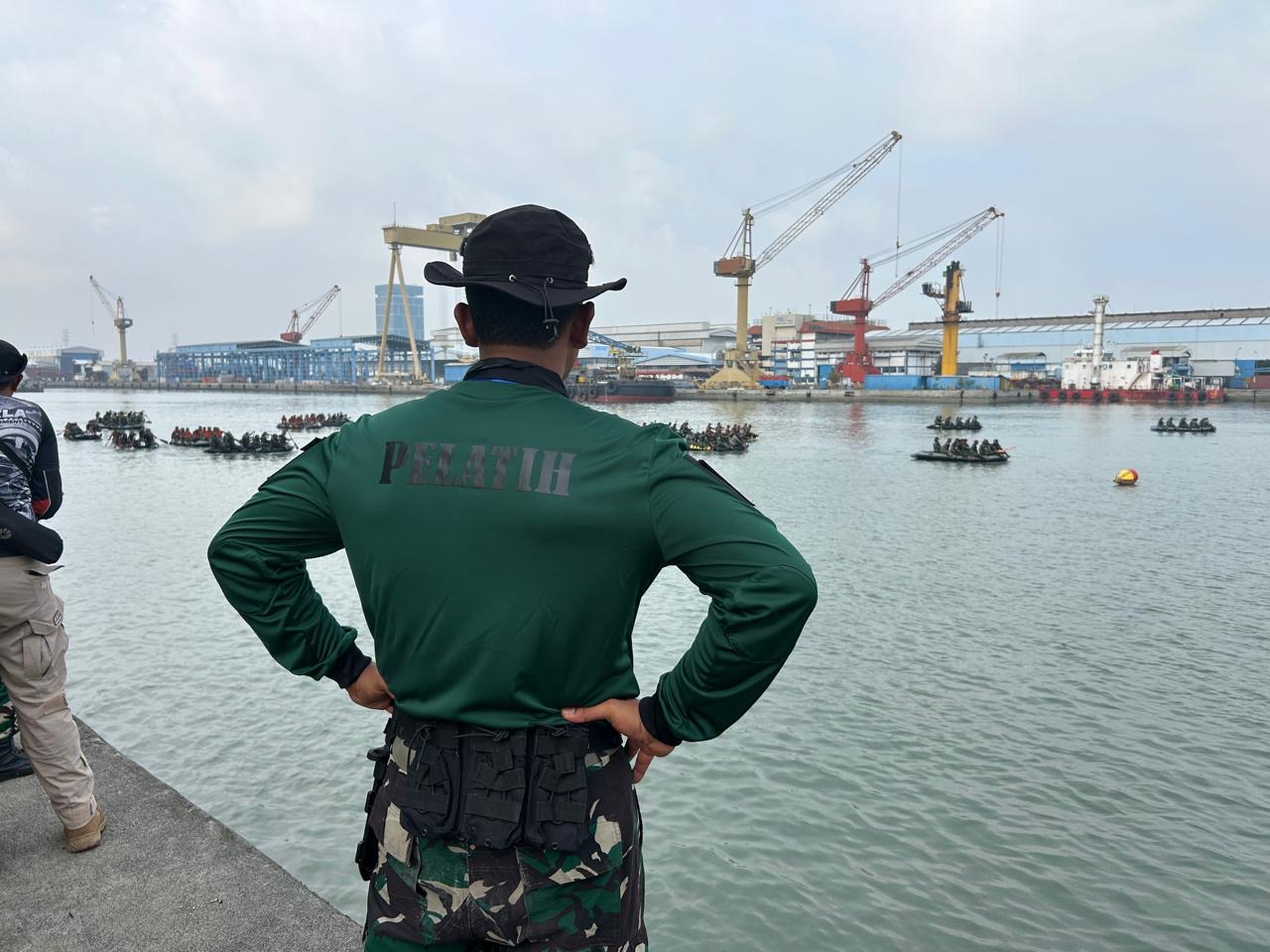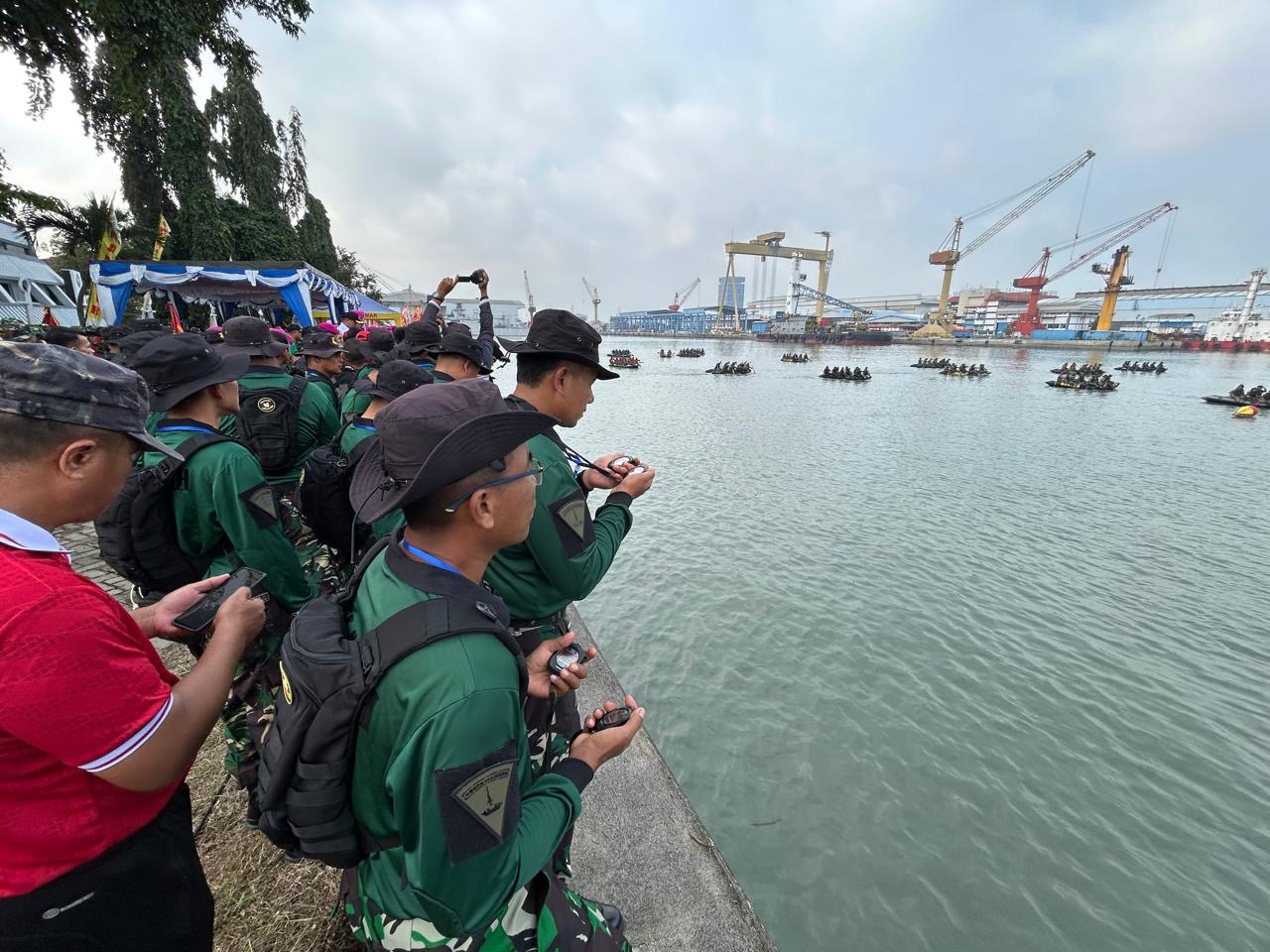Dispen Kormar (Surabaya). Dalam rangka HUT Pasmar 2 tahun 2025, prajurit pelatih Pusat Latihan Pasukan Pendarat (Puslatpasrat) dukung lomba renang laut dan dayung perahu karet Selat Madura prajurit Pasmar 2 di dermaga Madura Koarmada II Ujung, Surabaya, Rabu (26/02/2025).