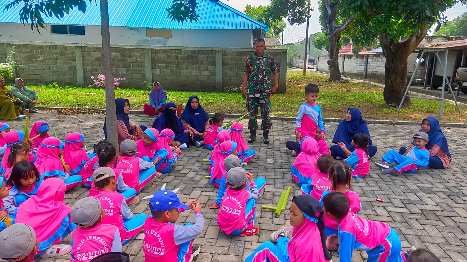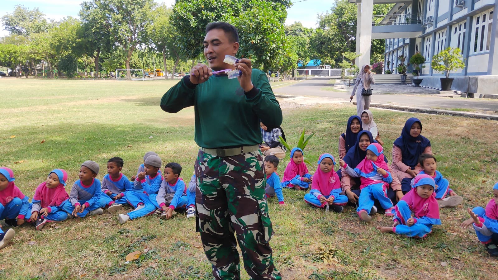 Dispen Kormar Situbondo - Pelatih Pusat Latihan Pertempuran Marinir (Puslatpurmar) -5 Baluran laksanakan sosialisasi edukasi terhadap anak anak usia dini Paud As Syafi'iyah Kecamatan Cerme Kabupaten Bondowoso di Markas Komando (Mako) Puslatpurmar -5 Baluran. Sumberwaru Banyuputih, Situbondo. Rabu, (5/6/2024).