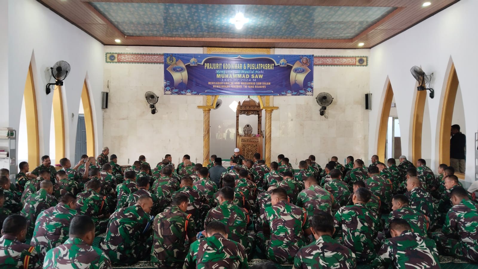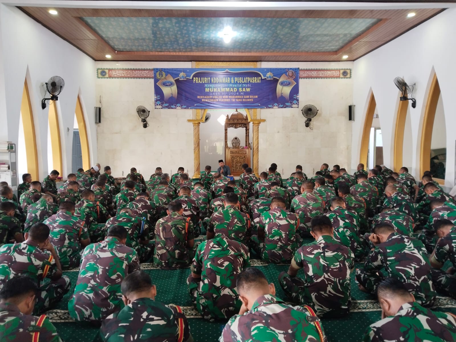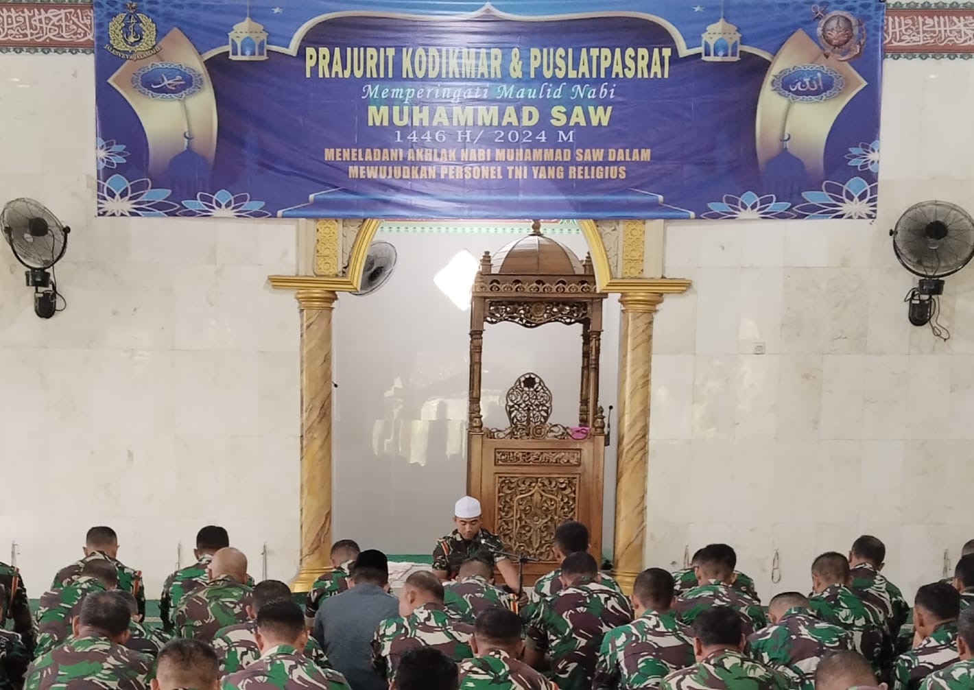 Dispen Kormar (Surabaya) - Dalam rangka peringatan Maulid Nabi Muhammad SAW 1446 H/2024 M prajurit Kodikmar dan Puslatpasrat menghadirkan penceramah Ustazt Putut dari Surabaya dengan tema "Meneladani Akhlak Nabi Muhammad SAW Dalam Mewujudkan Personel TNI Yang Religius", bertempat di Masjid Baitul Anwar Ksatrian Marinir Ewa Pangalila Gunungsari Surabaya, Kamis (19/9/2024).