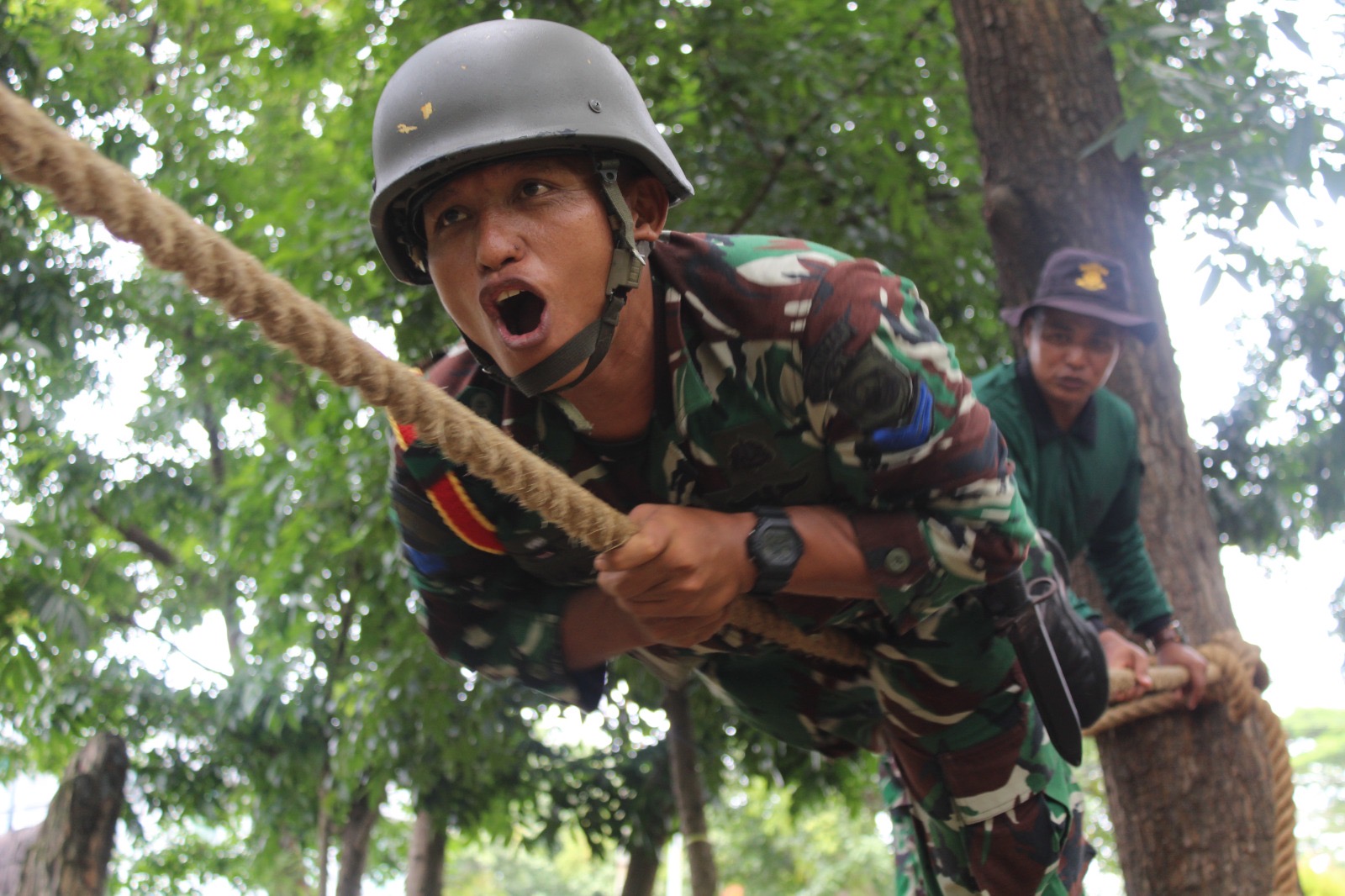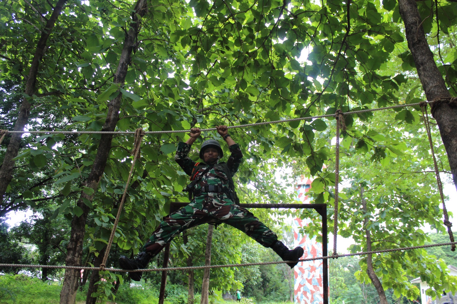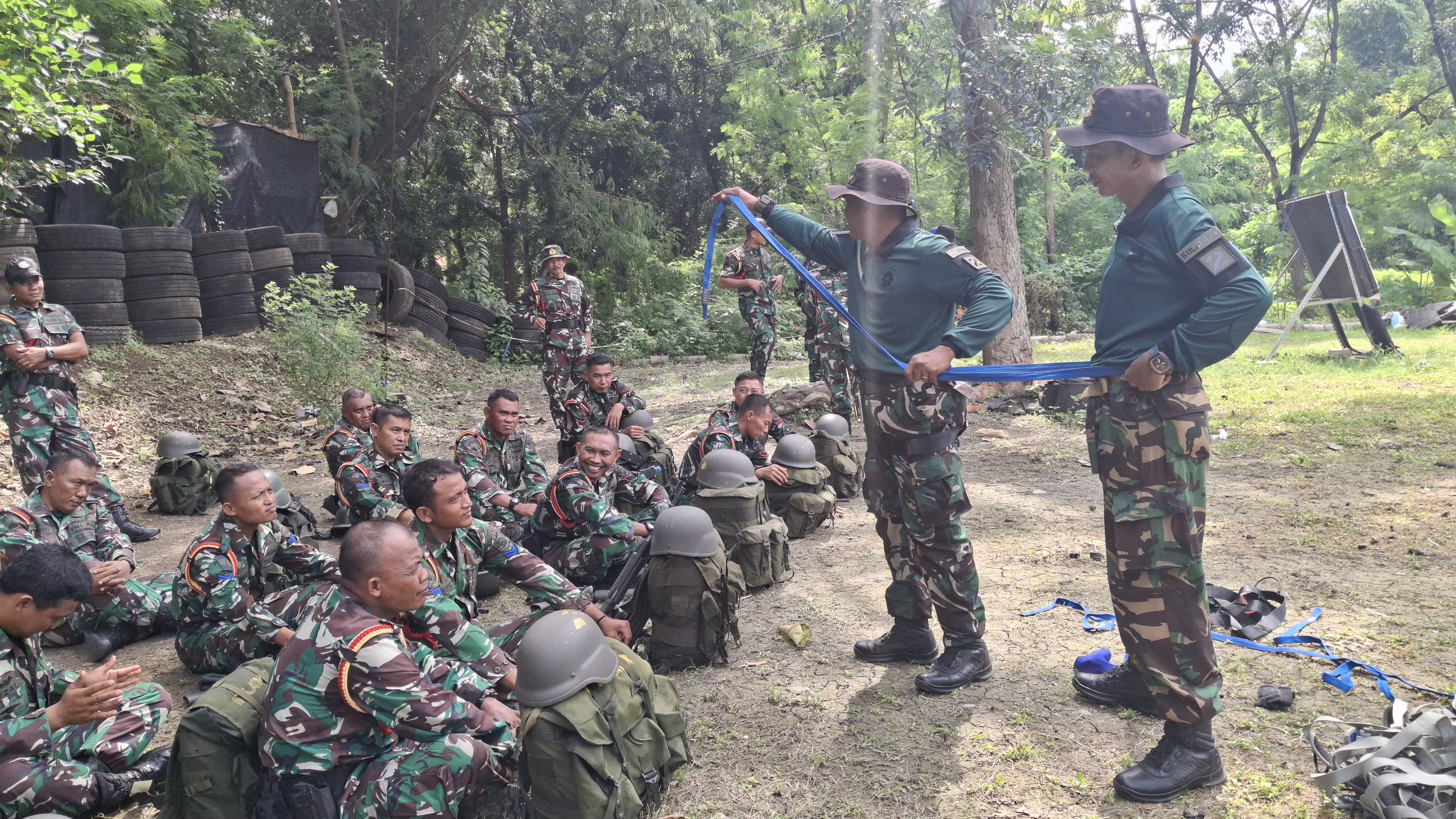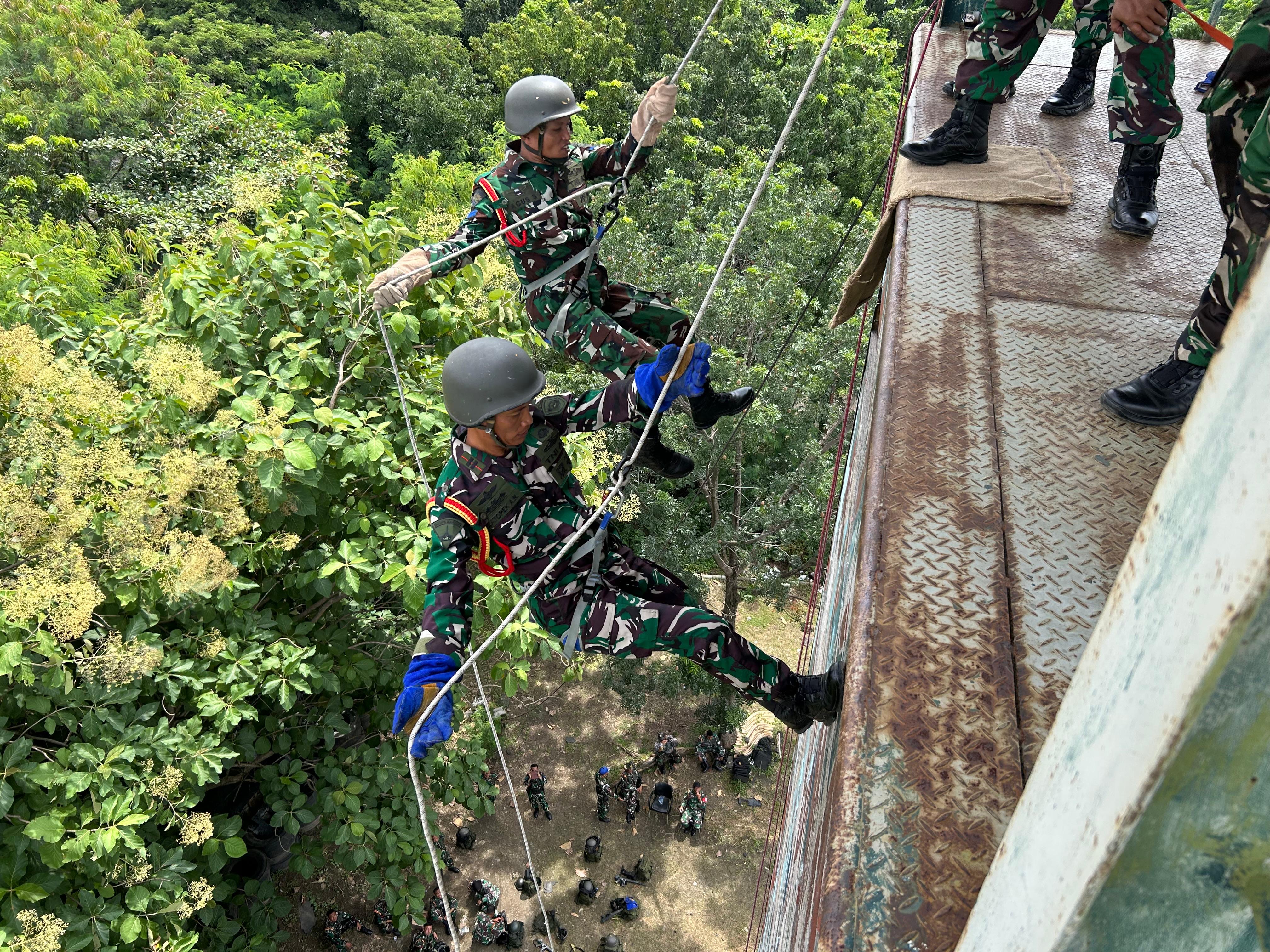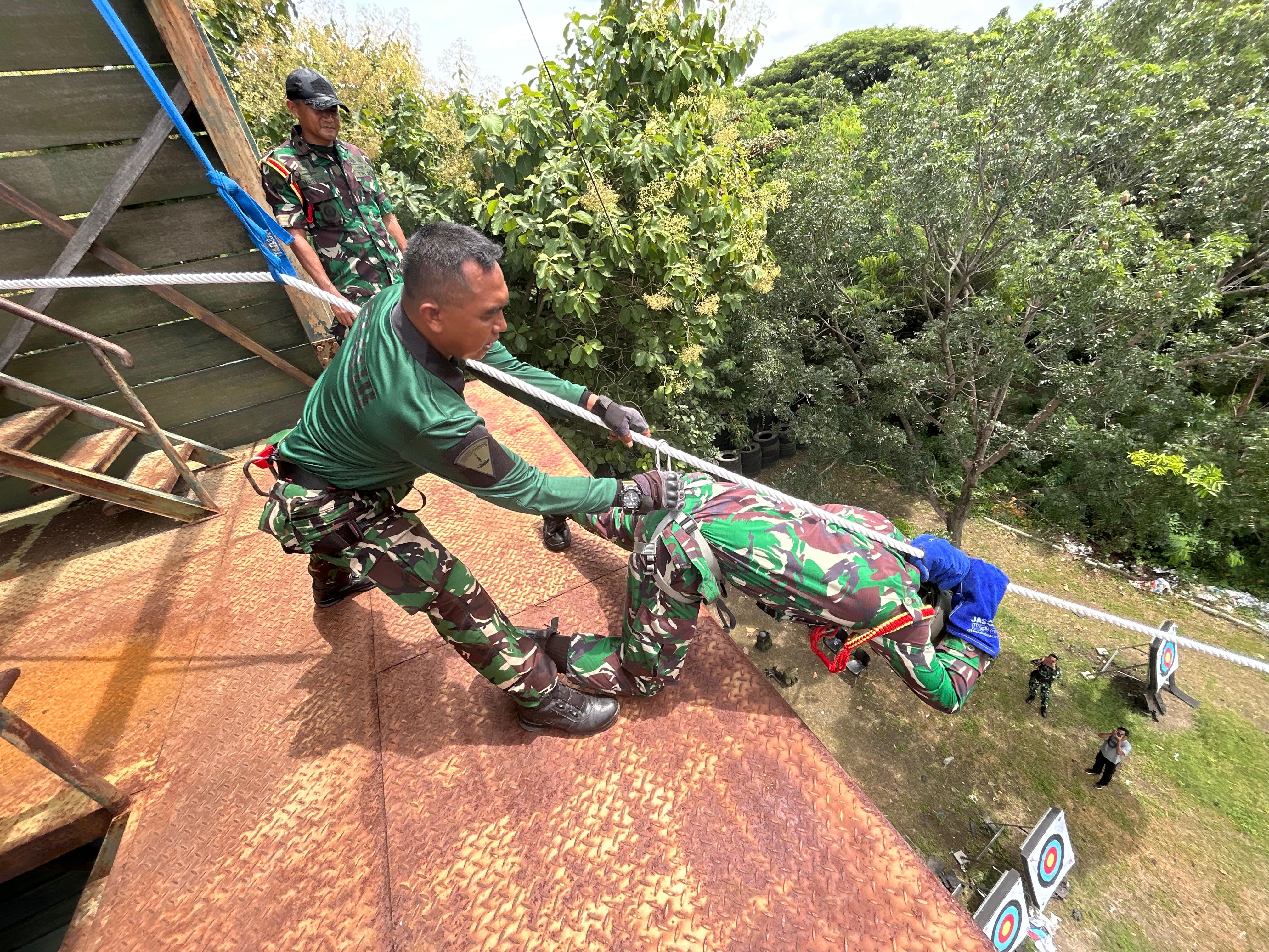 Segenap Prajurit Pusat Latihan Pasukan Pendarat (Puslatpasrat) melaksanakan kegiatan Latihan Perorangan Dasar (LPD) Triwulan I tahun 2025 dengan materi Mountaineering dan Rivercrosing di tower Ksatrian Marinir Ewa Panggalila Gunungsari Surabaya, Selasa (18/2/2025).