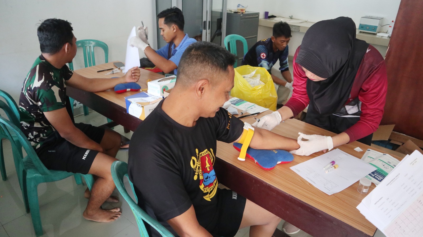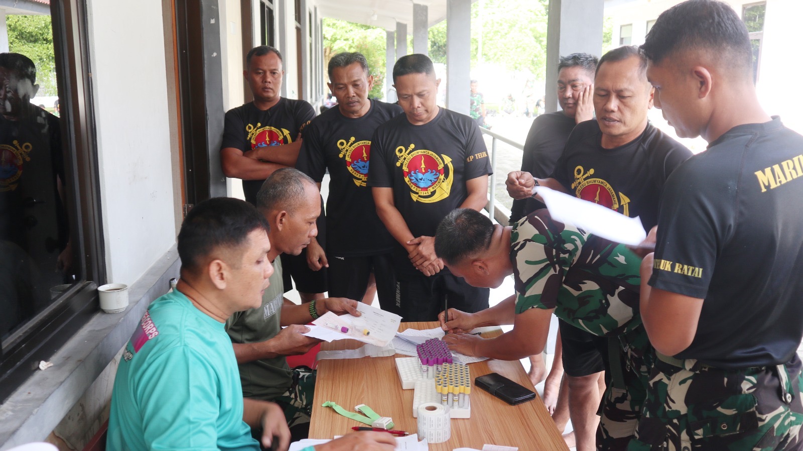 TNI AL, Dispen Kormar (Lampung). Prajurit Puslatpurmar-8 Teluk Ratai melaksanakan Uji Pemeriksaan Kesehatan (Urikes) rutin tahun 2025 dengan tim pemeriksa kesehatan dari Dinas Kesehatan Korps Marinir (Diskes Kormar) di Balai Kesehatan (BK) Marinir Piabung Pesawaram Lampung. Kamis (23/01/2025).