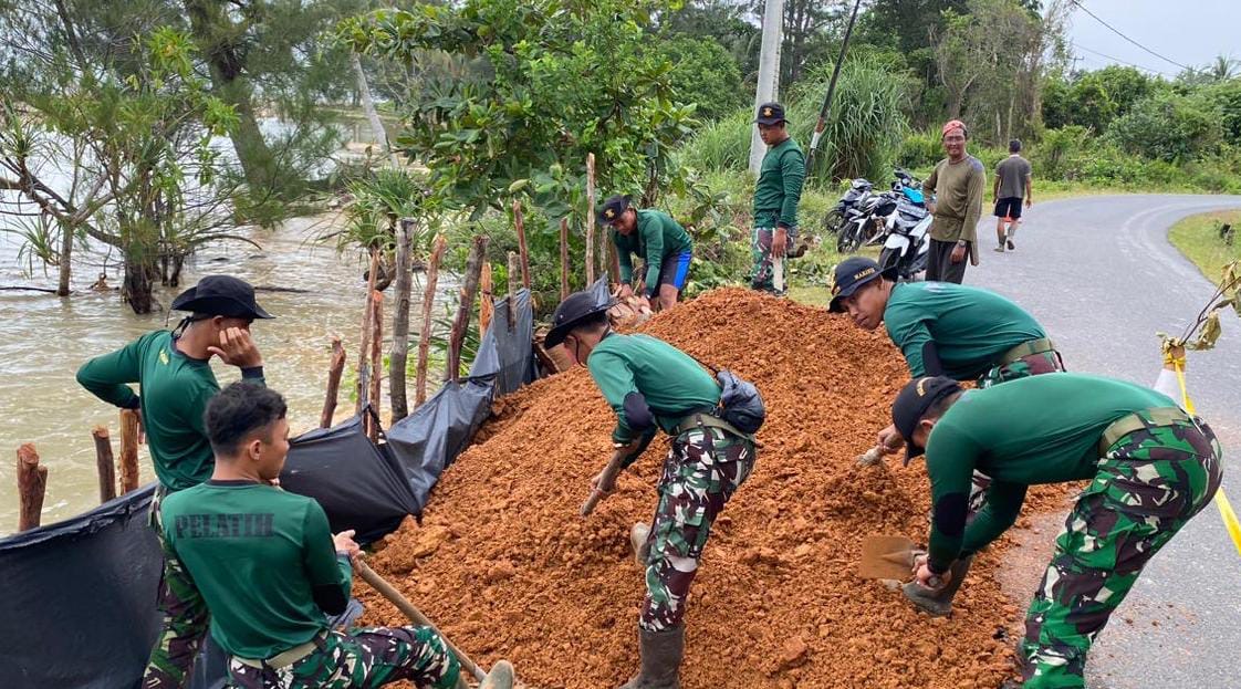 Tiada halangan bagi prajurit pelatih Puslatpurmar 9 Dabo Singkep turun serta membantu proses pembuatan dan penimbunan jalan yang terdampak abrasi.