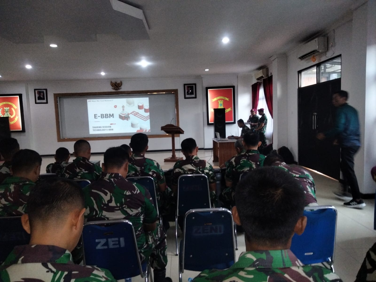 Kegiatan rapat penerapan digitalisasi e-BMM dan penggunaan QR Code pada SPBT (Stasiun Pengisian Bahan Bakar TNI) yang diselenggarakan di ruang rekreasi Yonzeni 1 Marinir yang dibuka oleh Dandenbek Lanmar jakarta.