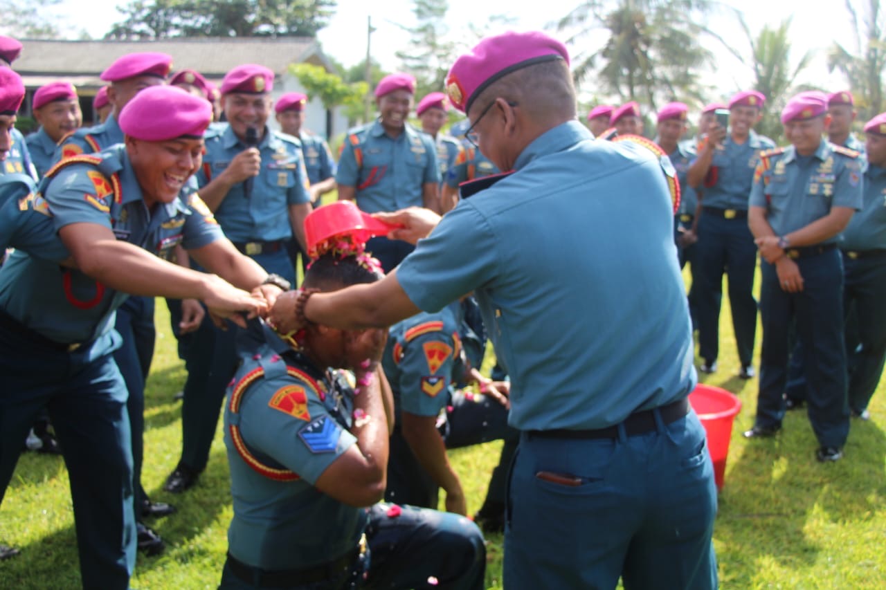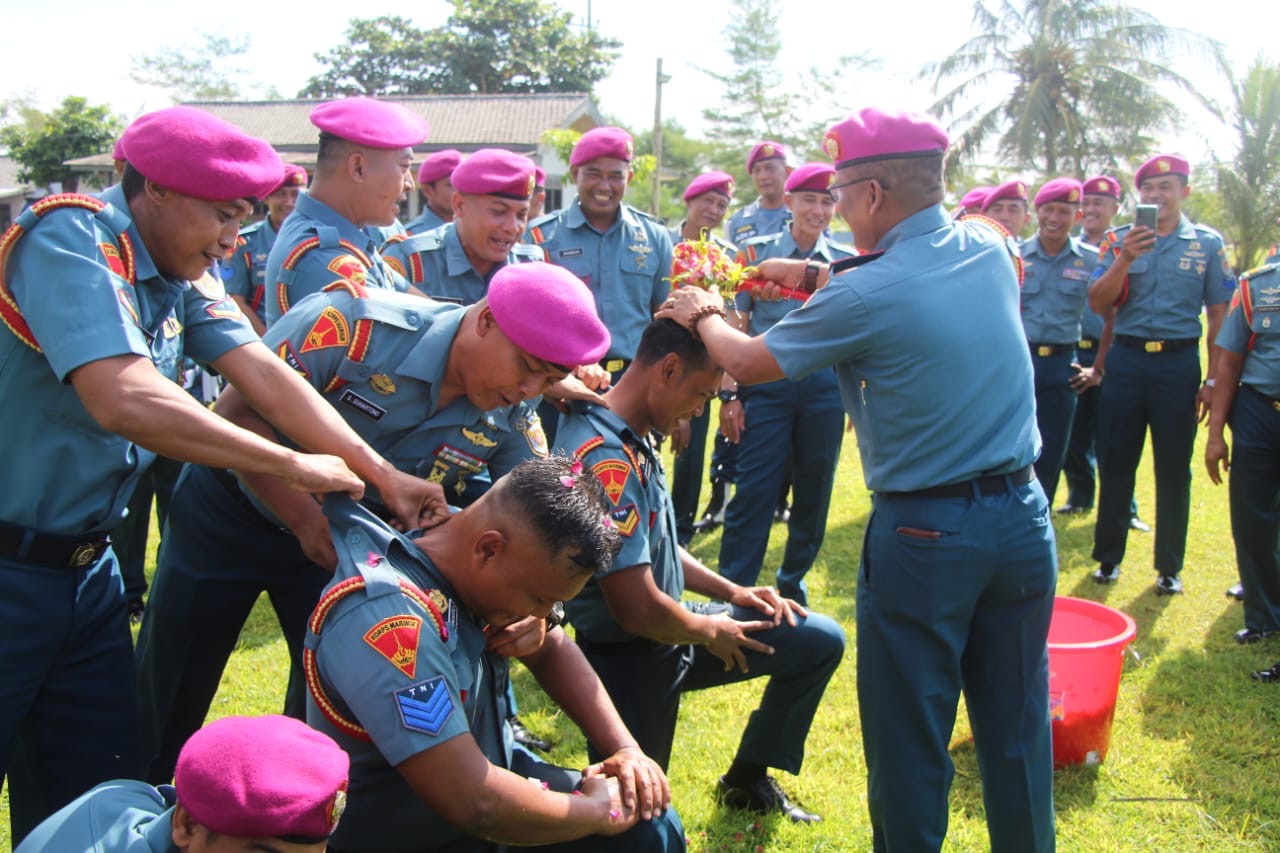 Dispen Kormar (Banyuwangi)- Personel Puslatpurmar 7 Lampon yang mendapat kenaikan pangkat satu tingkat lebih tinggi periode 1 April 2025 menjalani tradisi siraman air kembang usai Upacara Kenaikan Pangkat, bertempat di lapangan apel Mako Puslatpurmar 7 Lampon, Selasa (8/4/2025).