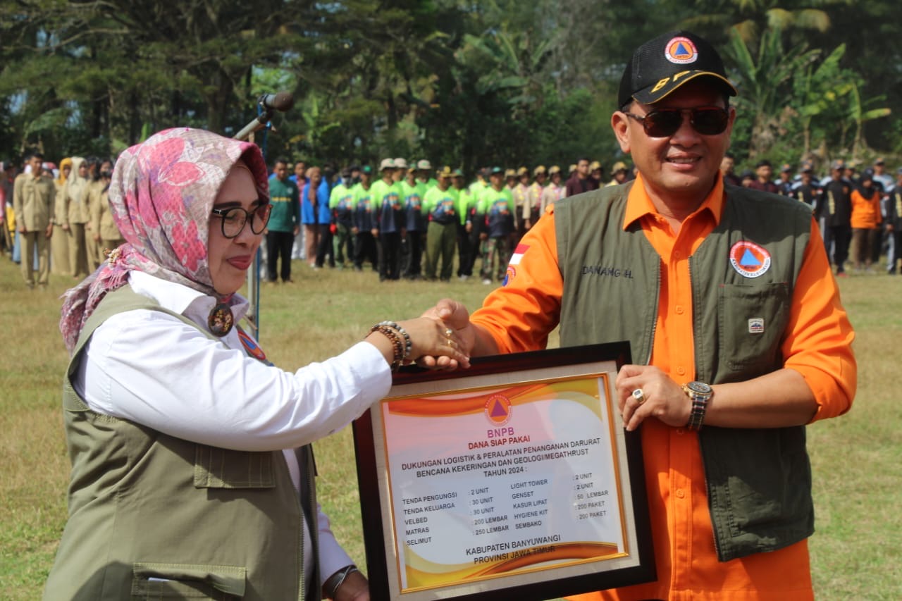 Pada pelaksanaan acara apel siaga tersebut di hadiri unsur Forkopimka plus dan juga di berikan bantuan alat dan prasarana untuk menghadapi bencana dari BNPB Banyuwangi.