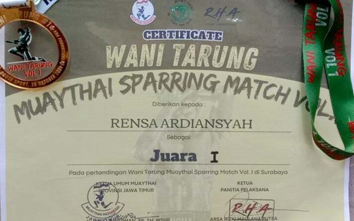 Dengan semangat tinggi dan displin latihan serta arahan sang ayah Ananda Rensa Ardian selalu tampil memukau dalam setiap pertandingan, otomatis hasil yang didapat sesuai dengan harapan, juara satu pada ajang wani tarung Muanythai menorehkan lagi prestasi yang didapatnya, jangan besar hati teruslah berlatih, ujar sang ayah yang selalu setia mendampinginya.