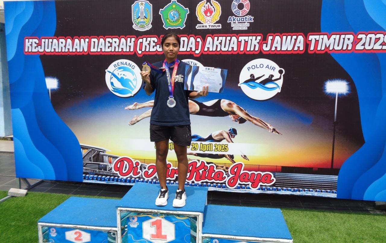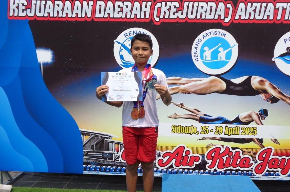 TNI AL, Dispen Kormar (Surabaya). Membanggakan, Putra Putri Peltu Mar Haniel anggota Pusat Latihan Pasukan Pendarat (Puslatpasrat) berhasil membawa pulang 7 Medali pada Kejuaraan Daerah Jatim Swimming 2025 Jawa Timur yang diselenggarakan oleh KONI Jawa Timur di kolam renang Deltras GOR Sidoarjo Jatim pada tanggal 25 - 27 April 2025. Surabaya, Jawa Timur. Senin (28/04/2025).
