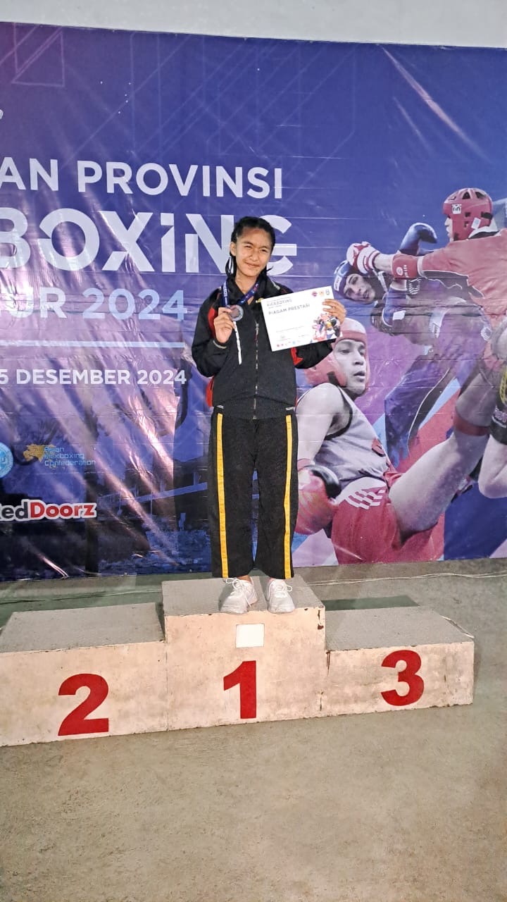 Dispen Kormar (Banyuwangi)- Velyndia Widi Oktamayasanti (14) anak Marinir yang raih juara 1 Point Figthing 61 Cadet Kejurprov Jatim Th. 2024 yang digelar di Malang pada tanggal 14-15 Desember 2024.