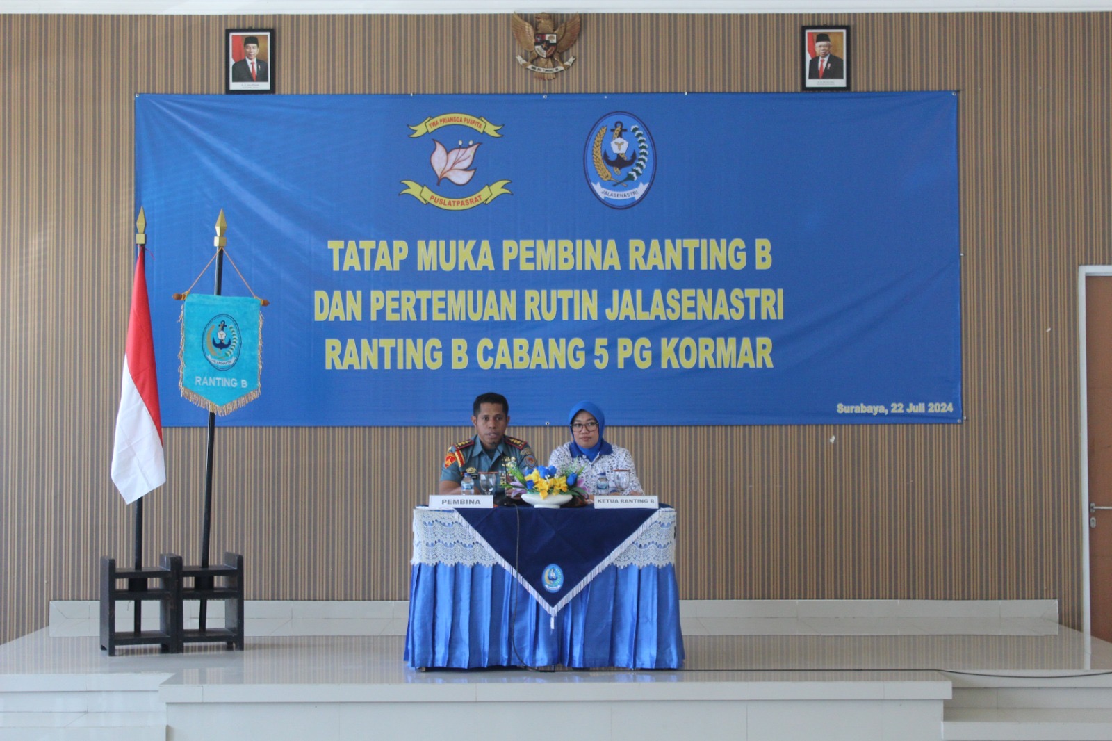 Dispen Kormar (Surabaya)- Pembina Jalasenastri Ranting B Cabang 5 PG Kormar melaksanakan pertemuan rutin dan tatap muka dengan seluruh anggota Jalasenastri Ranting B Cabang 5 PG Kormar di gedung Olah Yudha (OYU) Puslatpasrat Gunungsari Surabaya, Senin (22/07/2024).